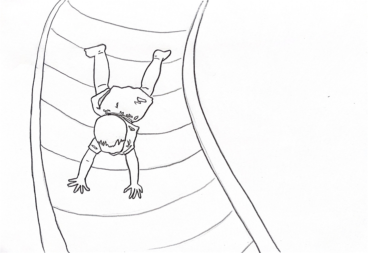 그러다 겁도 없이 미끄럼틀도 타겠다는 것이다. 안 그래도 집에 있는 미끄럼틀을 워낙 잘 타서 지난번 놀이터에 나왔을 때 미끄럼틀을 한 번 태워보았는데, 집에서처럼 엎드려서 앞으로 내려오던 아이는 가파른 부분에서 무서웠는지 손을 짚고 말았다. 그 바람에 앞으로 고꾸라져 머리가 쿵하고 부딪히며 크게 울음을 터뜨렸던 것이다. 그래서 이번엔 미끄럼틀 타는 것을 말리려고 했는데, 아이가 망설임 없이 들어서는 바람에 한 발 늦고 말았다. 어쩔 수 없이 얼른 밑으로 내려가 기다리는데 놀랍게도 아이가 부드럽게 슝~하고 미끄러져 내려오는 것이 아닌가. 지난번과 같은 자세로 내려왔는데 이번에는 슈퍼맨 자세를 유지하며 자신감 있게 내려왔다. 거기서 나는 또 한 번 놀랐다. 그런 아픈 경험을 하고도 용기 있게 다시 미끄럼틀을 타겠다고 나선 것도, 지난 실패를 통해 무언가를 터득했는지 같은 자세로도 고꾸라지지 않고 잘 타고 내려온 것도 새삼 신기했다.