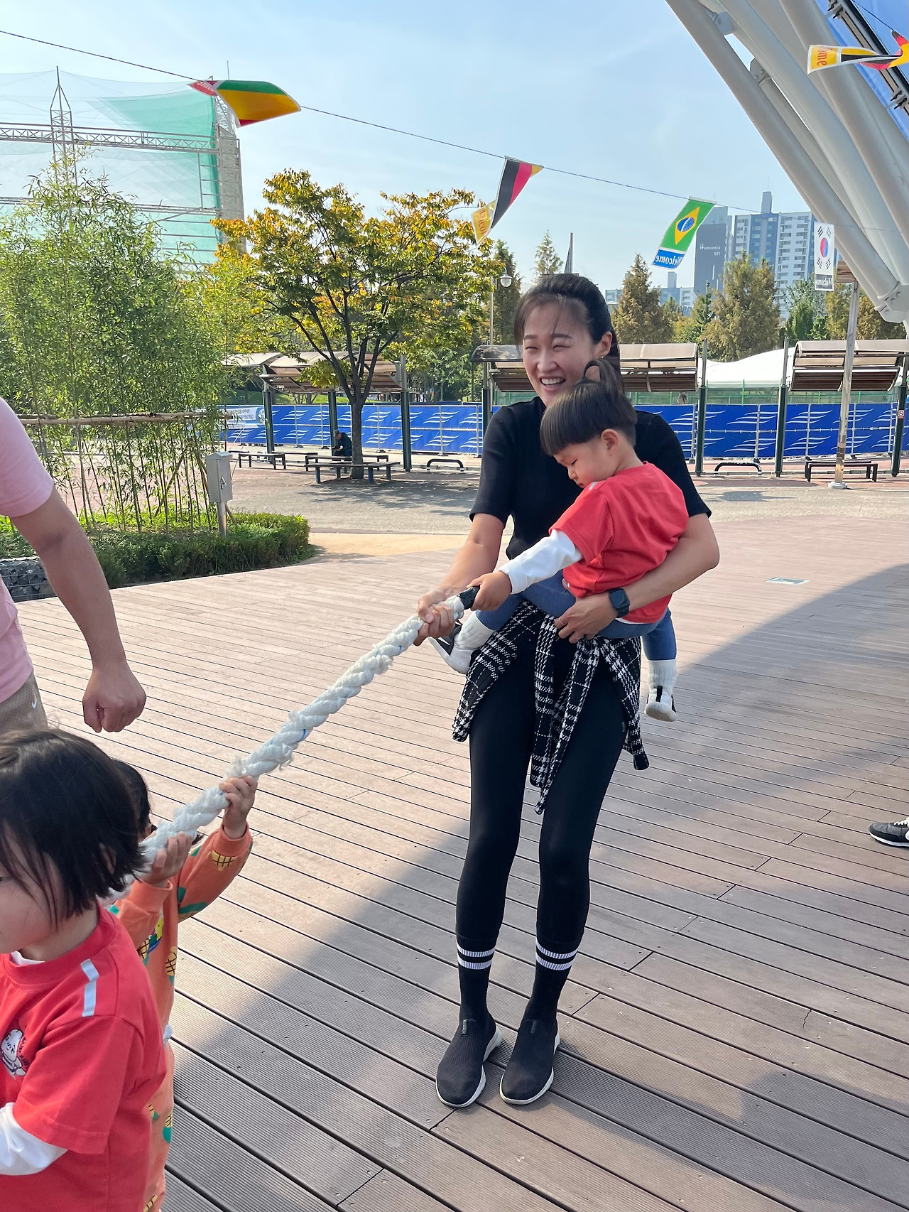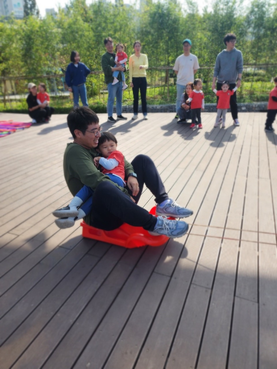 오늘은 여름이 어린이집에서 운동회가 있는 날이었다. 엄마아빠가 함께 참석하는 운동회라 어린이집에서는 혼자서 잘하던 것도 엄마아빠가 있기 때문에 좀 더 투정을 부리고 안기고 하긴 할 거라는 담임 선생님의 말씀이 있었지만 이 정도일 줄은 몰랐다. 여름이는 그 어느 게임에도 참여를 하지 않았다. 심지어 가만히 앉아서 썰매를 타거나 큰 대야에 앉아 있으면 엄마아빠가 들어서 날아가는 것처럼 해주는 활동에도 끝끝내 타지 않겠다고 버텼다. 결국 뭐라도 참여하게 해주고 싶은 체육선생님의 마음에 힘입어 혼자 유일하게 아빠에게 안겨 썰매를 타고, 엄마에게 안겨 대야에 앉아 날아보았다. 그 외에 활동에서는 계속 엄마아빠에게 내내 안겨있던 둘째. 어린이집 운동회였지만 엄마아빠만 적극적으로 게임에 참여한 꼴이 되었다. 운동회가 다 끝나고 점심식사를 한 후에야 컨디션이 돌아왔는지 바람개비를 들고 신나게 뛰어다니던 여름이. 다른 엄마들도 그런 여름이를 보며 이제야 여름이가 텐션이 올라왔다며 웃어 보였다. 나도 어이가 없어 웃음이 나왔다. 집에 와서 침대에 누워 여름이와 운동회 때 찍은 사진을 함께 보았다. 어떤 동영상은 두 번이고 세 번이고 다시 틀어달라고 하는 여름이였다. 그러더니 사진 속 운동회 장소를 가리키며 하는 말. "나 여기 가고 싶어!" 'ㅋㅋㅋㅋㅋㅋㅋㅋ 오늘 갔다 왔잖아 여름아. 운동회 때는 아무것도 안 하고 안겨만 있으면서 징징거리더니. 이제 와서 또 가고 싶다는 거 뭐야 ㅋㅋㅋㅋㅋ 그래, 적극적으로 참여하지 않았지만 그래도 너도 그 시간이 즐거웠던 거지? 엄마아빠랑 함께하는 그 시간이 좋았던 거지? 그래 엄마는 그렇게 생각할게~' 그러고는 아이에게 말했다. "그래~ 여름아 다음에 또 가자^^"