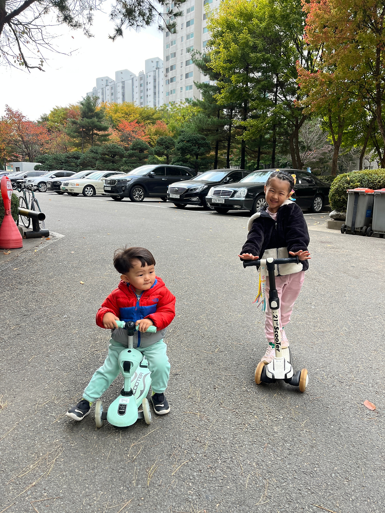 11월이 되었지만 오늘따라 날이 푹했다. 그래서 오늘은 하원 후에 아이들과 공원이나 놀이터에 나가 놀아야겠다고 생각했다. 금세 저녁시간이 될 것을 생각해 요기를 할 요량으로 고구마랑 사과, 귤 등을 챙겨서 작정하고 나갔다. 아이들은 신이 났다. 낙엽이 잔뜩 쌓인 길 위를 킥보드를 타고 달리는데 그 바스락 거리는 소리마저 경쾌하다. 가을이는 킥보드를 타다 말고 멈춰 서서 잔뜩 상기된 목소리로 ”가을이랑 봄이랑 겨울이랑 여름이랑 다 좋아! “라고 한다. 갑자기 뜬금없이 무슨 소린가 했다가, 그냥 이 모든 것이 다 너무 좋다는 뜻이겠거니 생각한다. 우리는 가을이가 좋아하는 놀이터로 갔다. 신이 난 가을이는 건널목 앞에서 기다리면서 여름이 킥보드에 쌓인 낙엽도 털어주고, 놀이터에 도착해서는 여름이가 멀리 세워둔 킥보드도 가져다 옮겨주었다. 밖에 나오길 잘했다는 생각이 들었다. 해가 일찍 지는 것이 아쉬웠다. 또래 친구들이 모두 떠난 놀이터에서 끝까지 놀다가 나온 뒤에도, 다른 공원에 있는 놀이터에서 또 한참을 놀고 나서야 집으로 돌아왔다. 몸은 고단했지만 기분은 좋았다. 뿌듯했다.