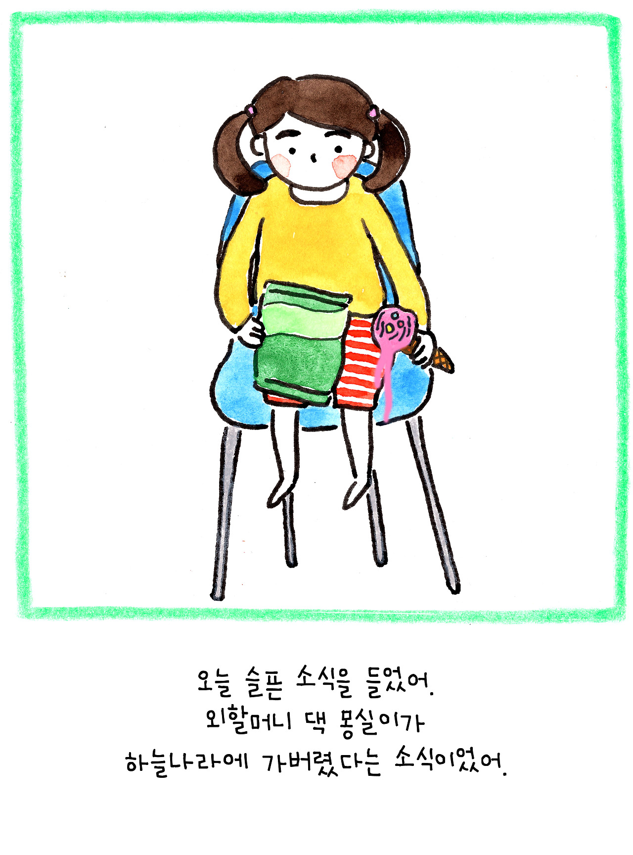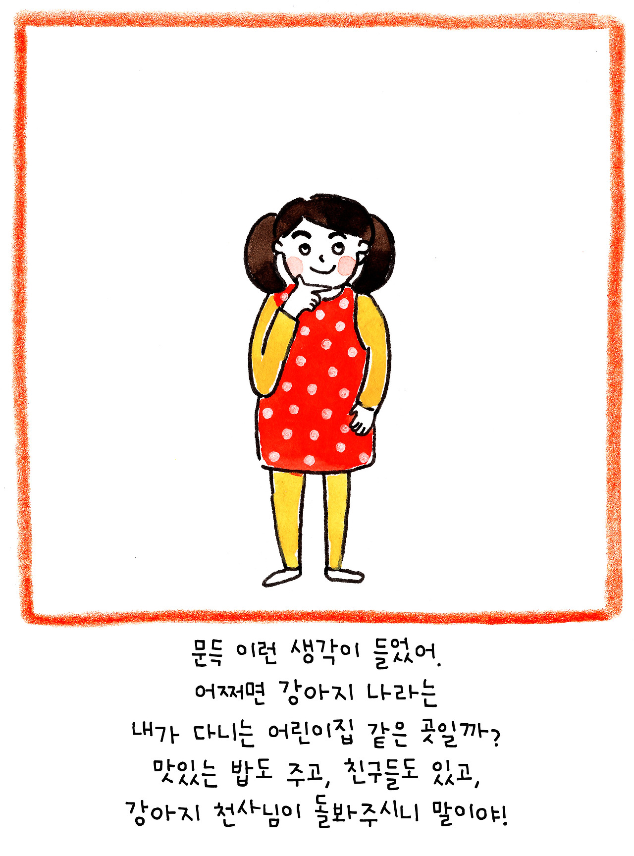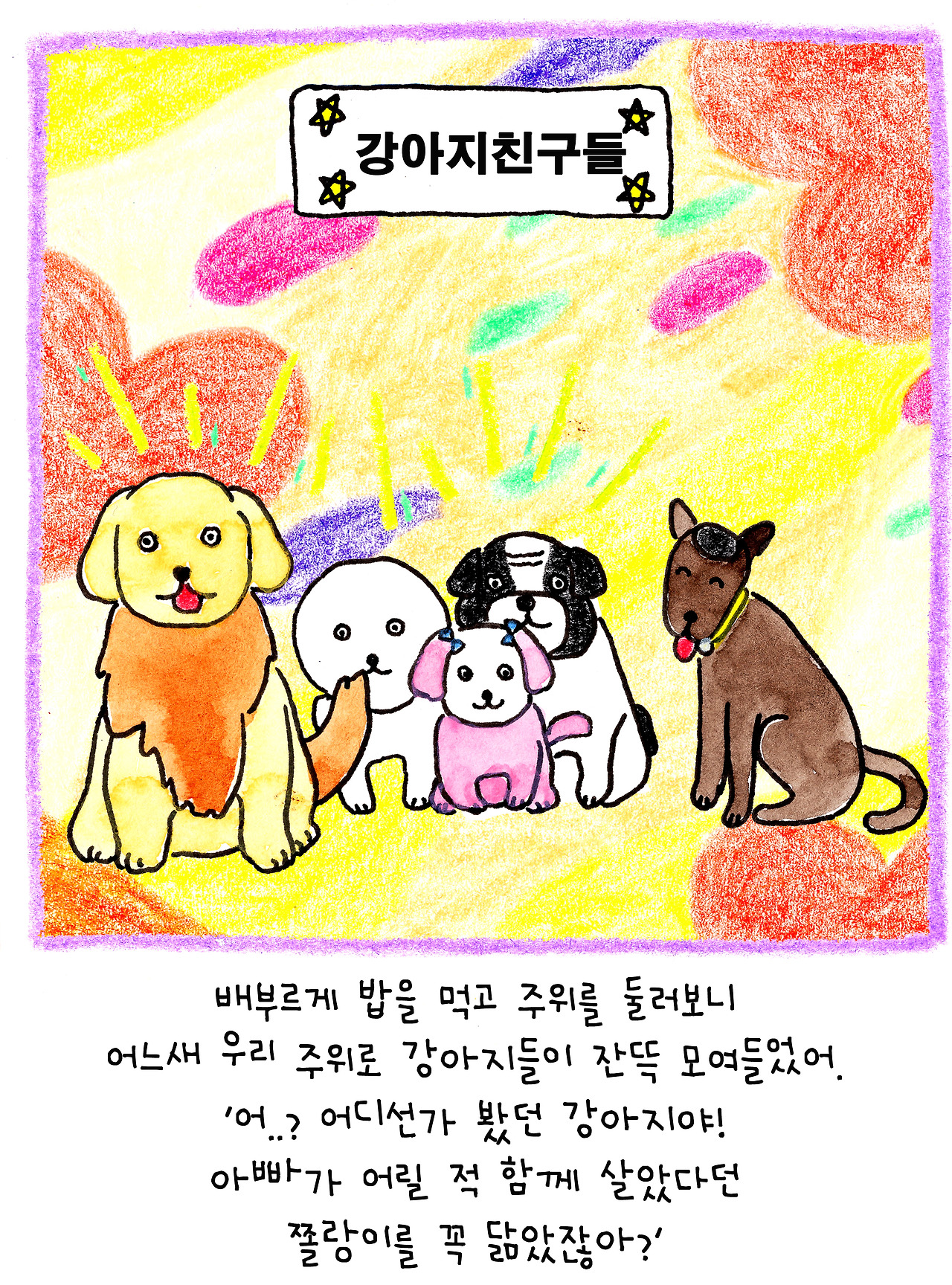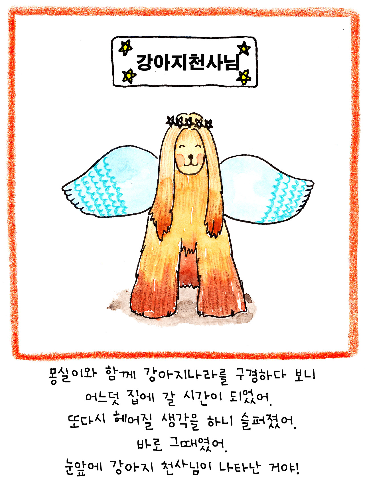 이 이야기는 저보다 더 큰 슬픔에 빠진 딸아이를 위해 만든 이야기입니다. 6살인 딸은 친한 친구였던 강아지의 죽음에 큰 충격을 받은 듯 했어요. 아이에게 죽음을 어떻게 설명해야 할지 난감했습니다.