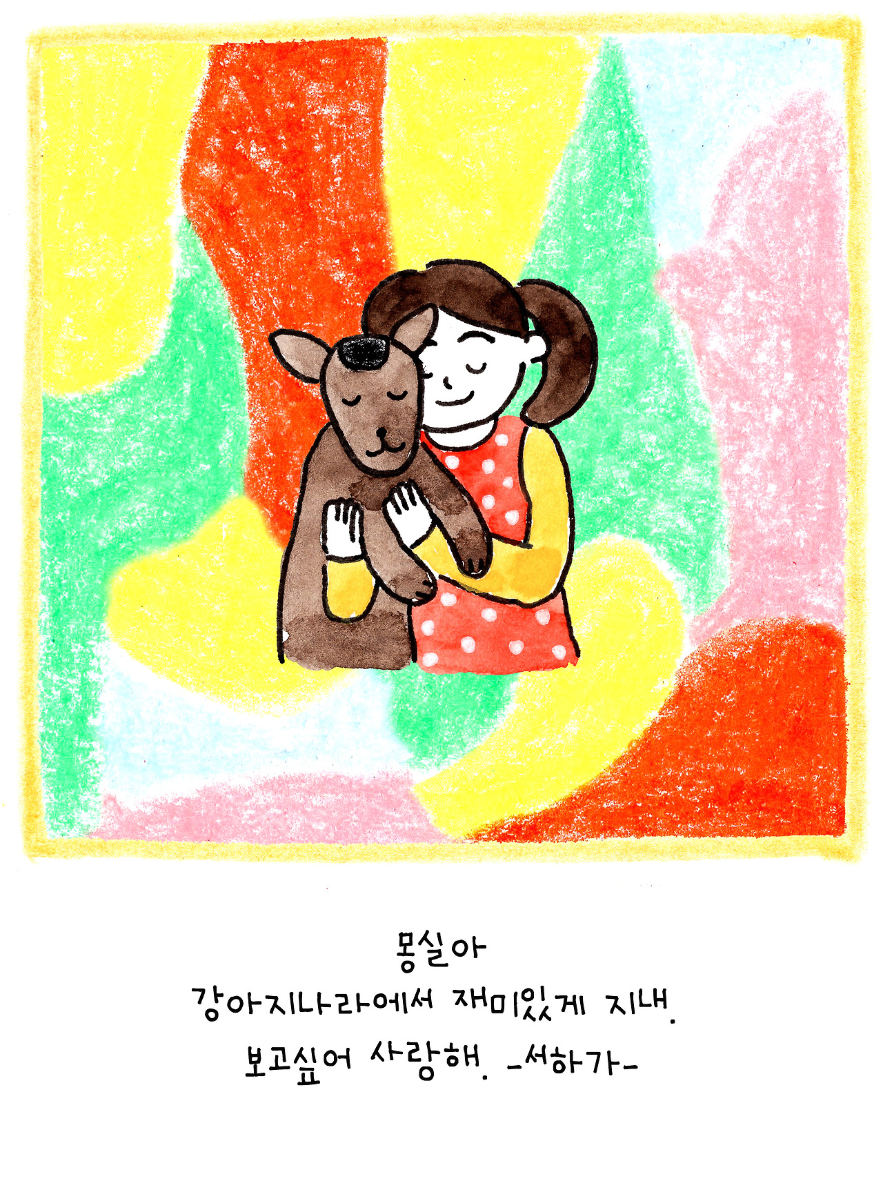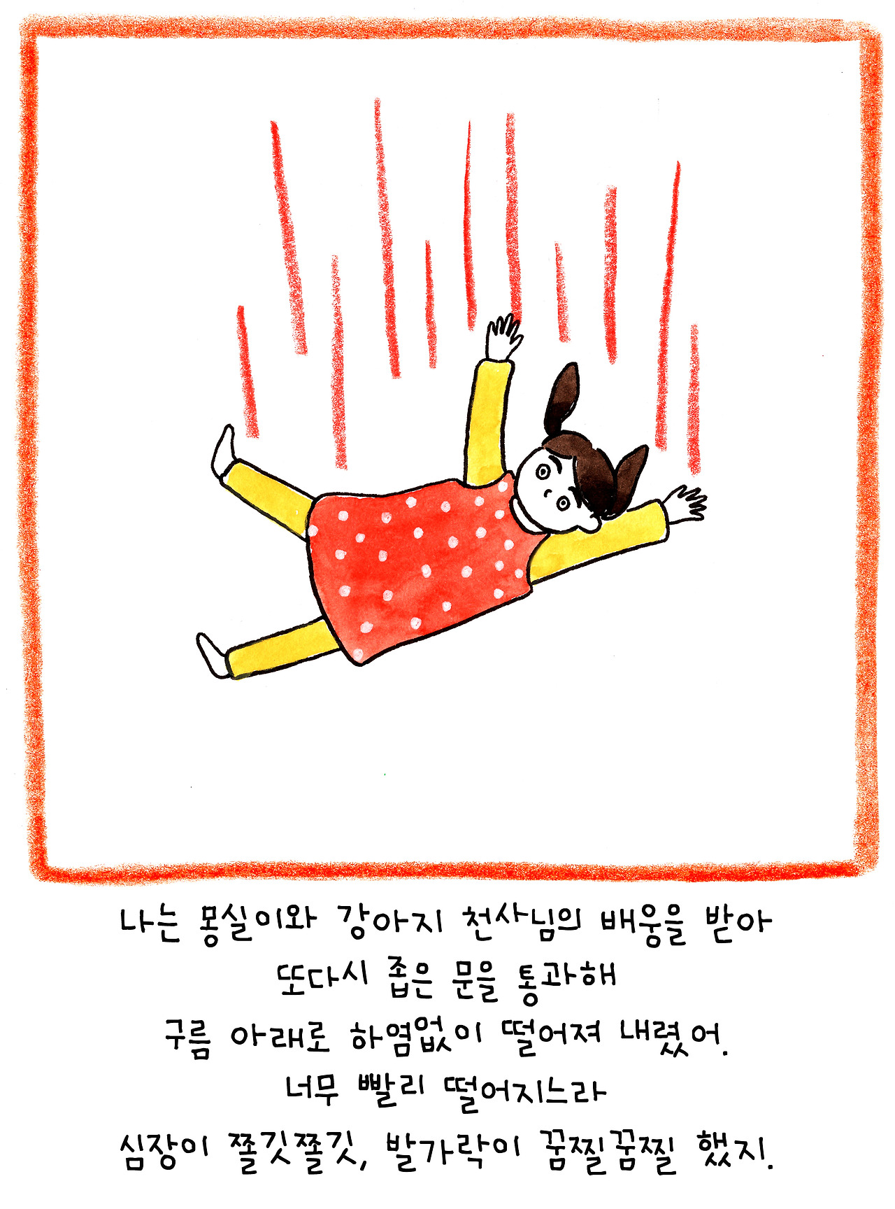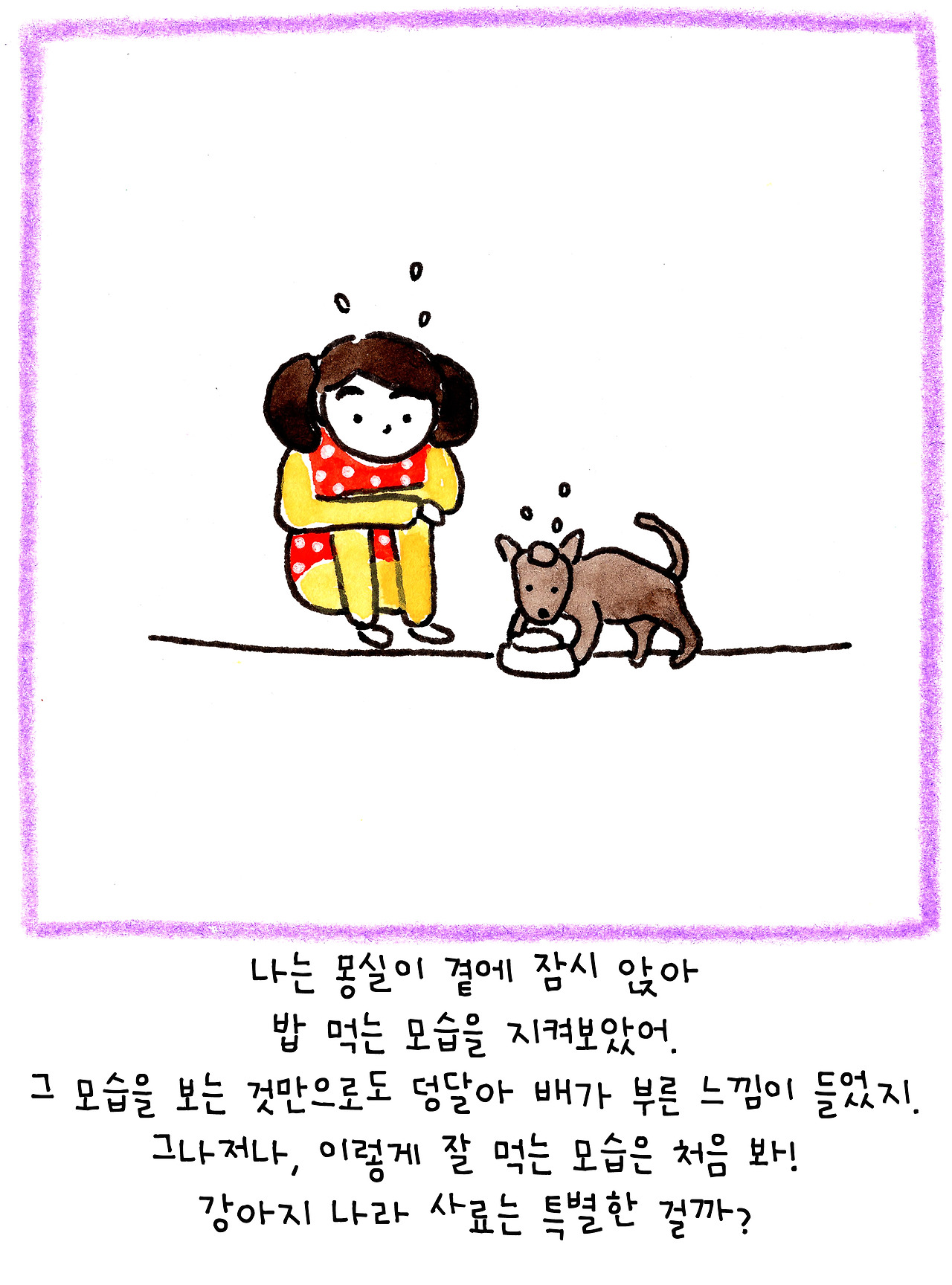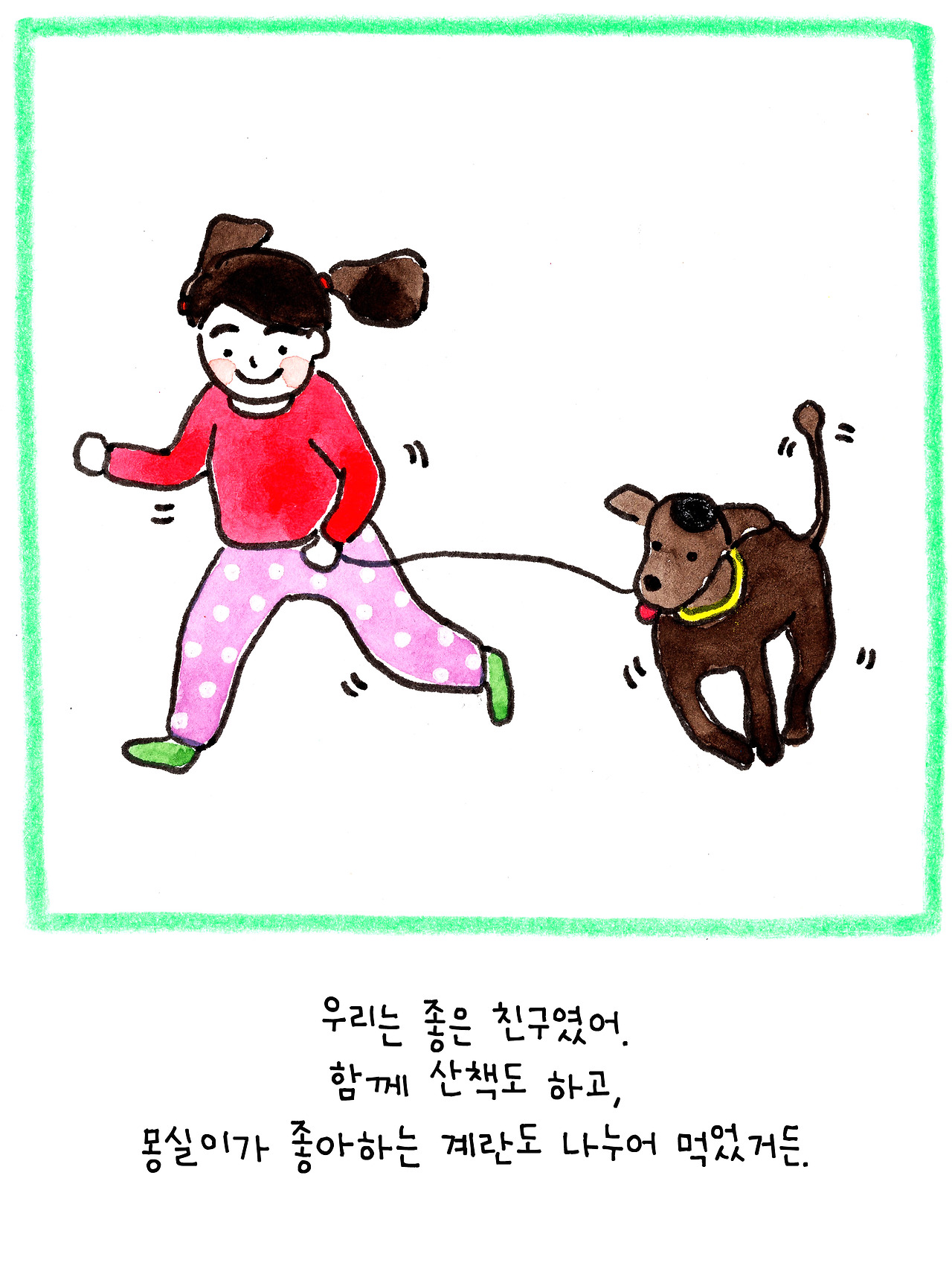 이 이야기는 저보다 더 큰 슬픔에 빠진 딸아이를 위해 만든 이야기입니다. 6살인 딸은 친한 친구였던 강아지의 죽음에 큰 충격을 받은 듯 했어요. 아이에게 죽음을 어떻게 설명해야 할지 난감했습니다.