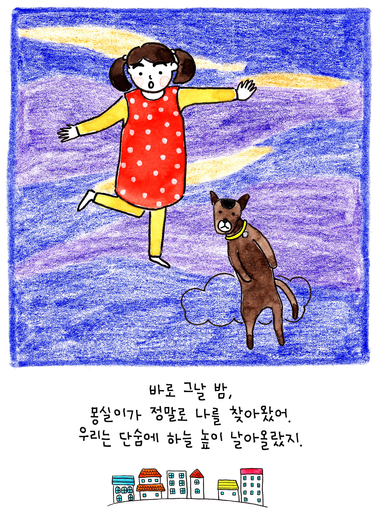 어린이들에게 반려동물의 죽음은 난생처음 경험하는 이별인 만큼 큰 충격으로 다가온다고 합니다. 그렇다고 마냥 감추거나 숨길 수도 없겠지요. 저는 반려동물의 죽음을 충격과 공포가 아닌, 아름다운 기다림으로 그리고 싶었습니다. 비록 우리의 곁을 떠났지만 더 좋은 곳에서 행복하게 지내고 있다는 상상을 통해, 반려동물과 이별한 모든 이들의 마음에 따스한 위로가 전해지길 바랍니다.