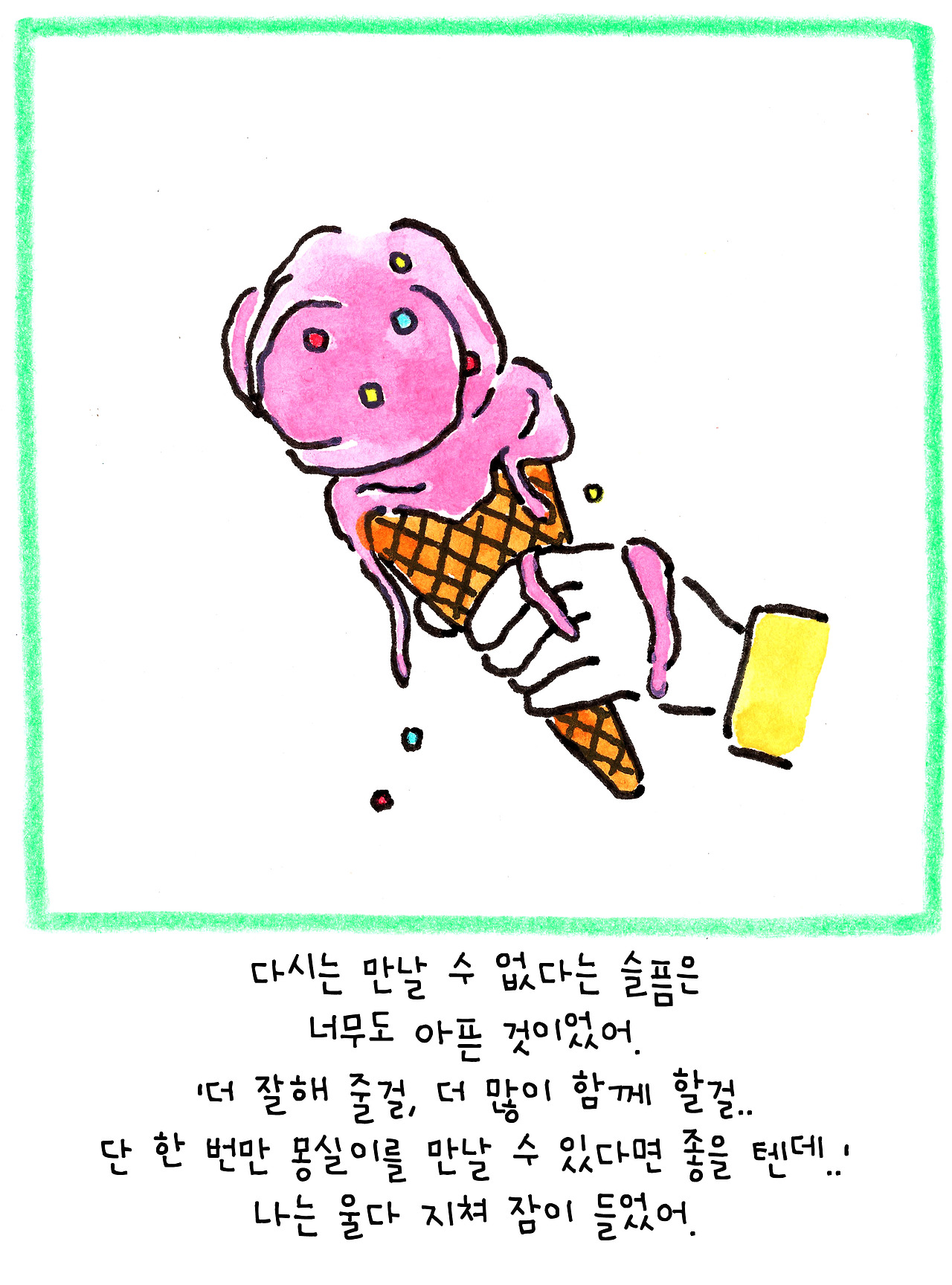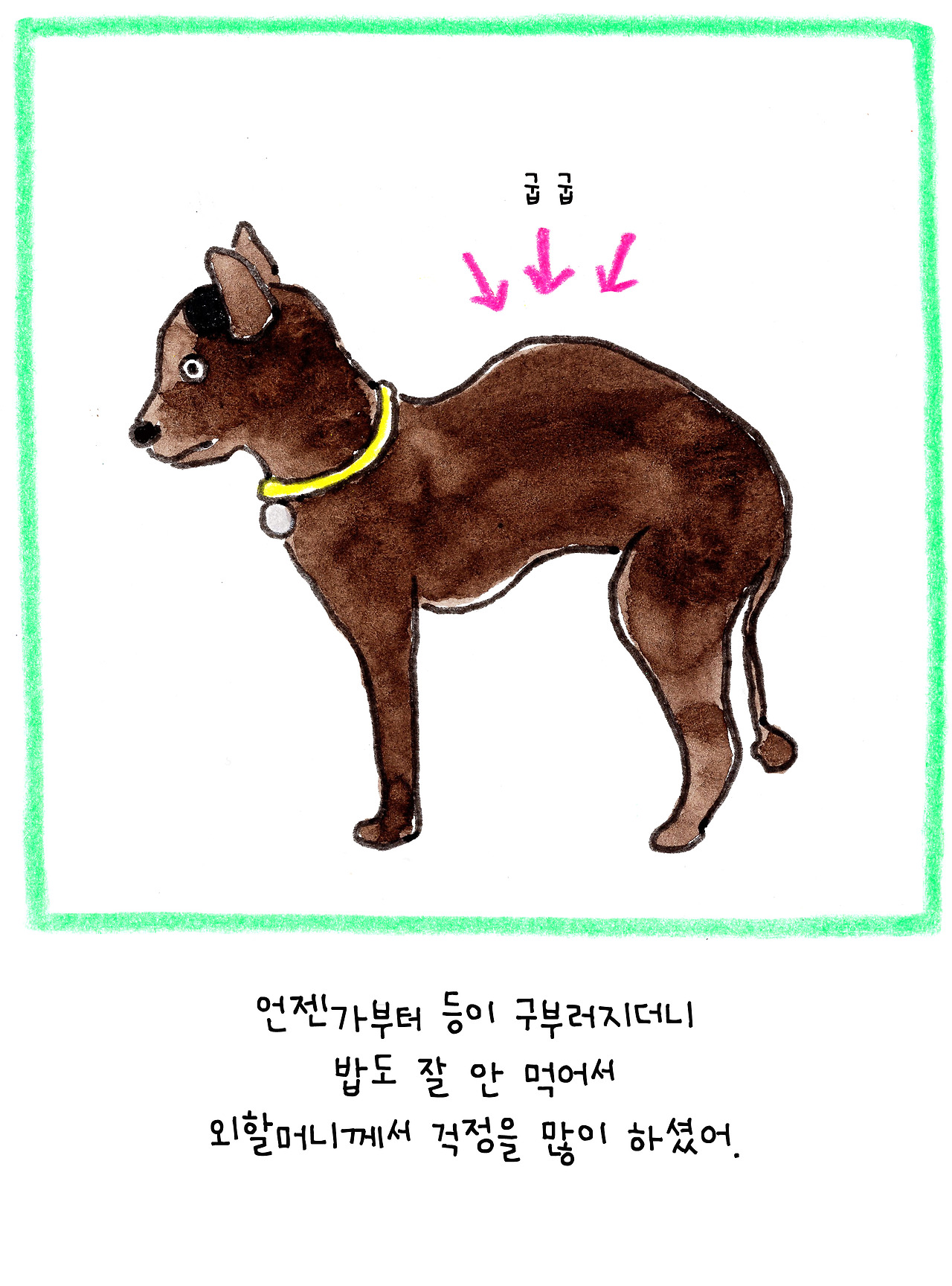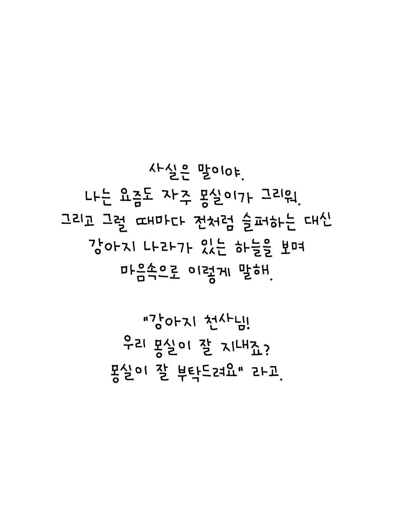 회사에서 일하던 중 한 통의 전화를 받았습니다. 시골에 계신 엄마가 기르시던 강아지가 죽었다는 소식이었습니다. 태어난 지 2년밖에 되지 않았지만 몸이 약해 늘 마음이 쓰였던 아이였어요. 더 자주 들여다보지 못한 미안함, 세심하게 돌보지 못했다는 죄책감, 다신 만날 수 없다는 그리움에 한동안 정신을 차릴 수가 없었습니다.