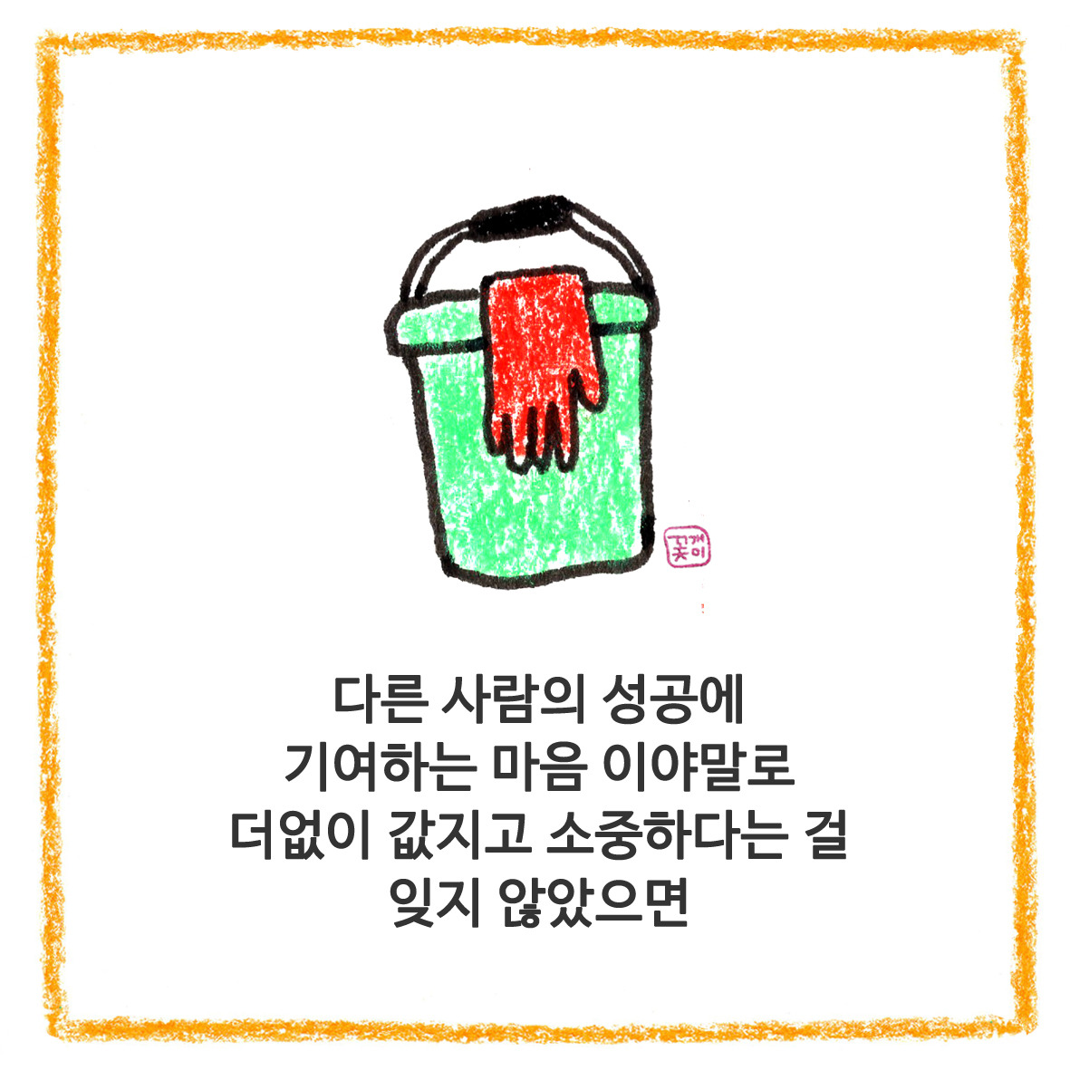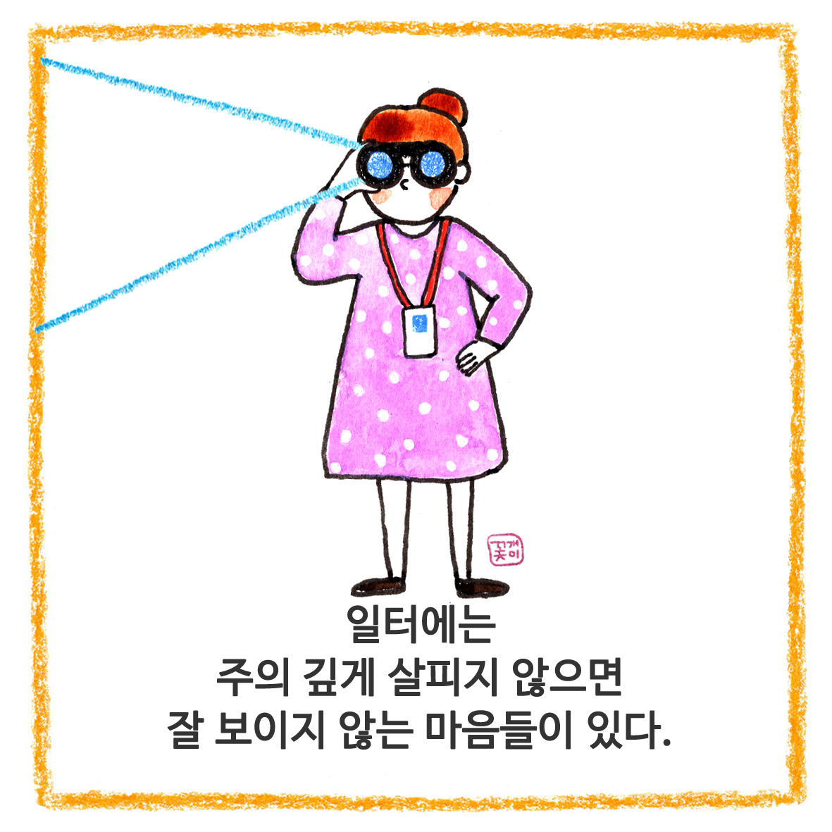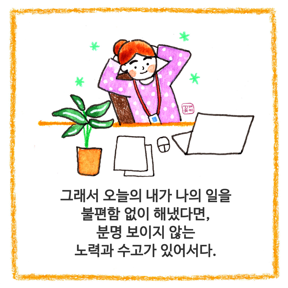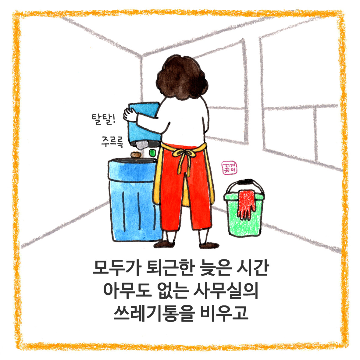 나는 일터에서 당연한 것은 하나도 없다는 이야기를 하고 싶다. 만일 오늘의 내가 나의 일을 아무런 불편함 없이 해냈다면, 그건 분명 누군가는 뒤에서 조용히 애를 쓴 덕분이다. 복사기에 채워진 A4용지, 아침이면 말끔히 비워진 휴지통이 바로 그 증거다. 부디 보이지 않는 이런 마음들을 당연하게 여기지 말고 고맙게 여겼으면. 그것도 어렵다면 그저 함께 일하는 동료의 마음으로 대했으면 좋겠다.