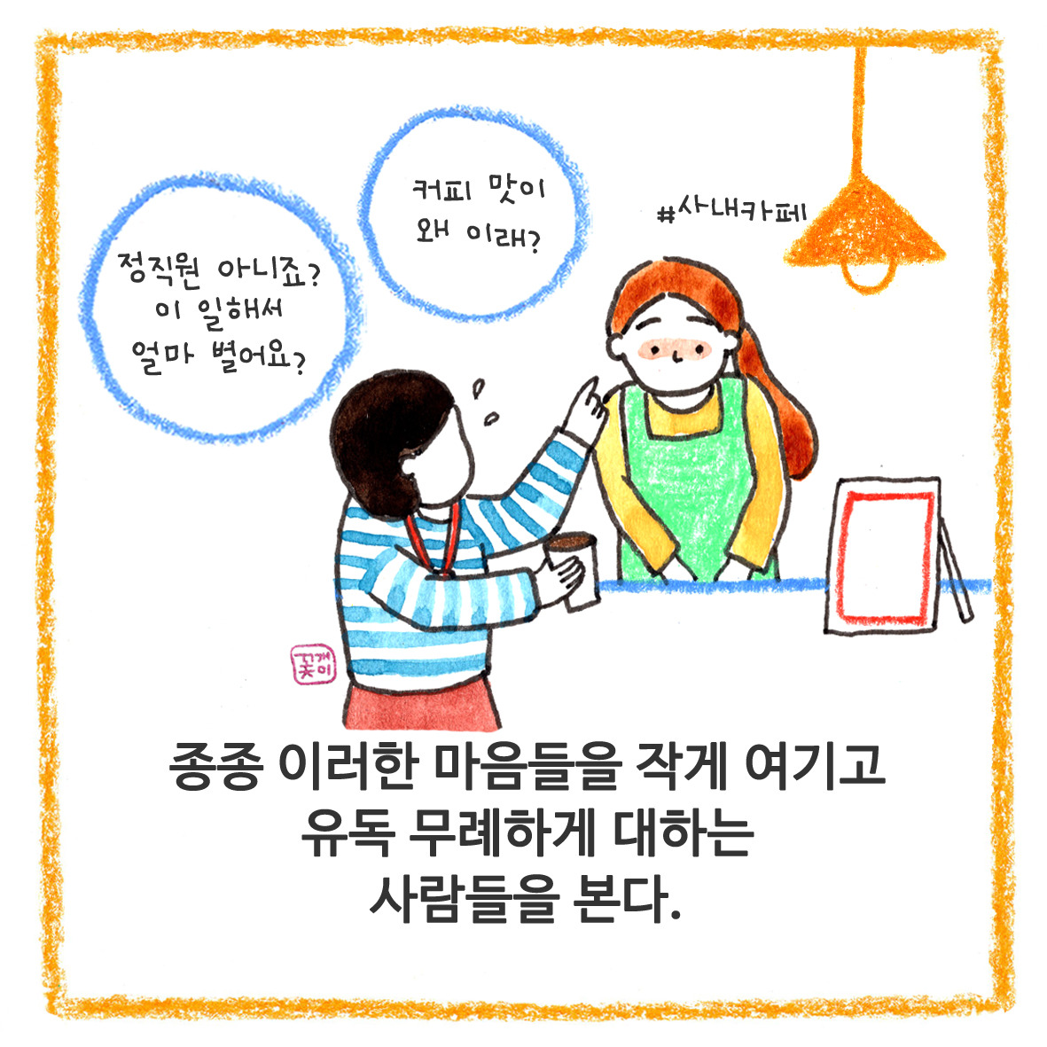 당연한 것에 고마운 마음을 갖기는 어렵지만, 조금 덜 충족되었을 때 사람들은 쉽게 무례해지는 것 같다. 최근 사내카페에서 일하던 직원이 그만두었다는 소식을 들었다. 그녀가 평소 상처를 많이 받았던 것을 나는 잘 알고 있었다. 유난히 커피가 맛이 없다는 이유로, 음료가 밀려 조금 늦게 나왔다는 이유로, 생글생글 미소 짓지 않는다는 이유로 상처를 준 것은 다름 아닌 직원들이었다. 어떤 사람은 "정직원 아니죠? 알바예요?"라고 하거나, "이 일 하면 얼마나 벌어요?"라는 질문도 서슴지 않는다고. 나는 우리 직원들의 무례함에는 교육담당자인 내 책임도 조금은 있는 것 같아 미안해진다.