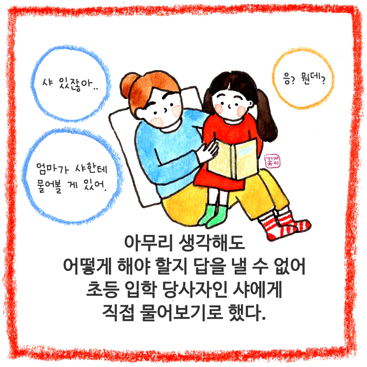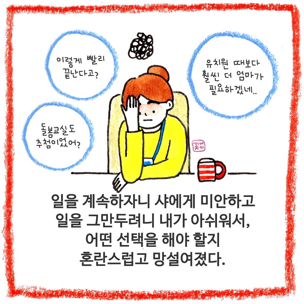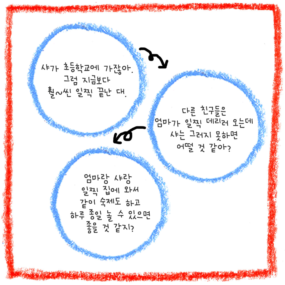 남의 애는 빨리 큰다더니 아무래도 그 말이 내게는 거꾸로 작용하는 것 같다. 아이는 쑥쑥 자라 올해 3월 초등학교 입학을 앞두고 있다. 예비소집일에 다녀온 후론 머릿속이 더 복잡해졌다. 입학 후 한동안은 점심 전에 끝난다는 것, 이후에도 저녁까지 아이를 봐주진 않는다는 안내를 받았다. 방과 후 교실은 선착순이기에 빨리 마감되고, 돌봄 교실에 맞벌이 부부는 후순위였다. 이 모든 내용을 종합해 보면 '초등학생의 곁에는 보호자가 상주해야 한다'는 결론에 도달하고야 만다. 일과 아이 중에 어떤 선택을 해야 할까.일을 포기하고 내가 행복할 수 있을까. 그렇다면 아이의 안전은 누가 책임지는가. 이런 고민을 하는 건 이기적인 일일까?혼란스러운 마음은 쉽게 진정되지 않았다.