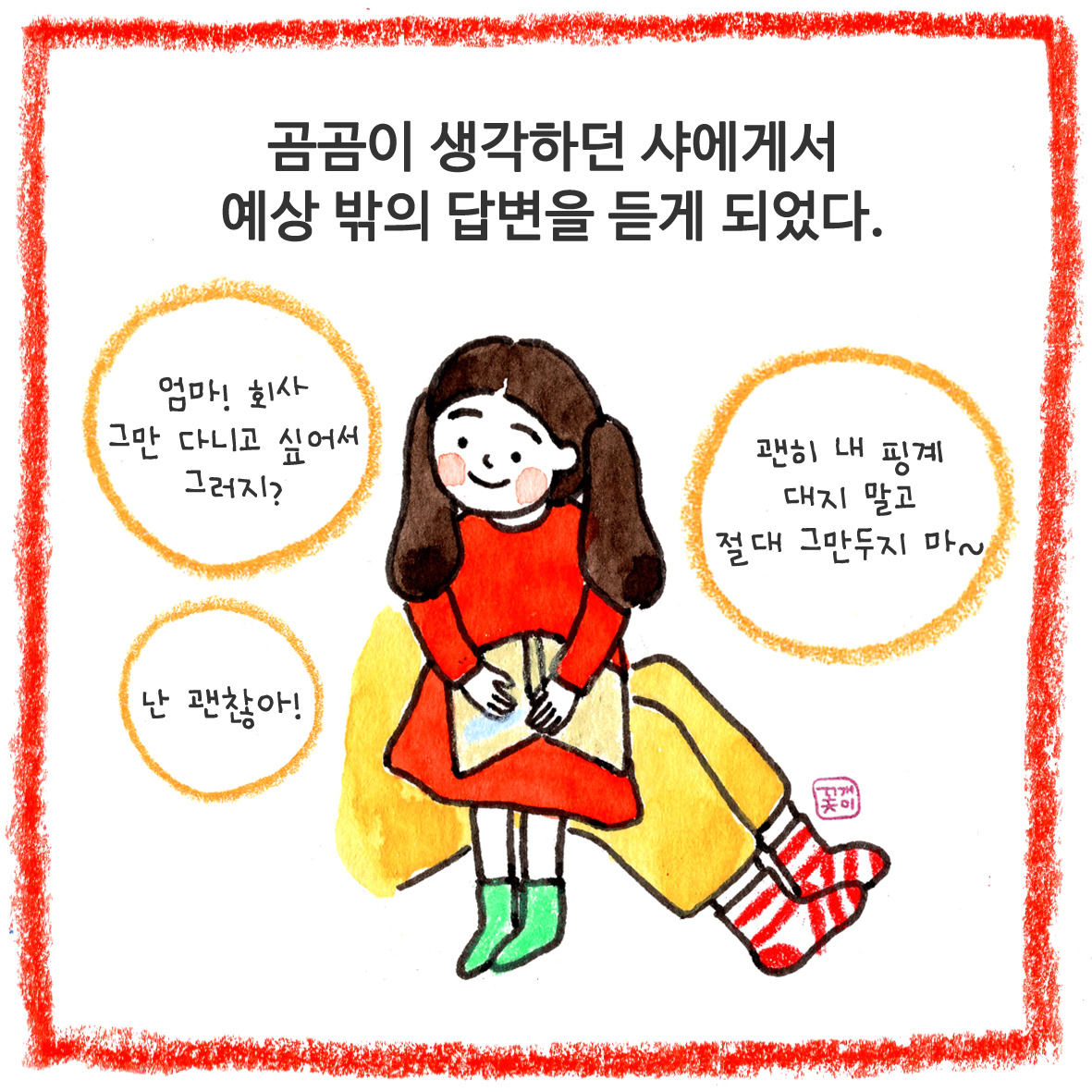문득 사직서를 제출하다 눈물을 쏟아버린 회사 직원이 떠올랐다. 당시에 나는 직무를 전환해 퇴직을 담당하던 때였는데, 퇴직을 앞둔 직원이 서류와 물품을 반납하다 말고 갑자기 엉엉 울어버린 것이다. 휴지를 가져다주고 울음이 그치기를 기다렸지만, 한번 터진 눈물은 쉽게 진정되지 않았다. 한참 후 조심스레 무슨 일인지 물었더니 초등학교 입학을 앞둔 아이가 분리불안이 있다고, 그 증세가 심해져 바지에 대소변을 억지로 보는 지경에 이르렀다는 것이다. 이 모든 게 자신의 탓이라는 자책, 그럼에도 정말로 퇴사하고 싶지 않았다며 그녀는 더 슬프게 울어 버렸다.