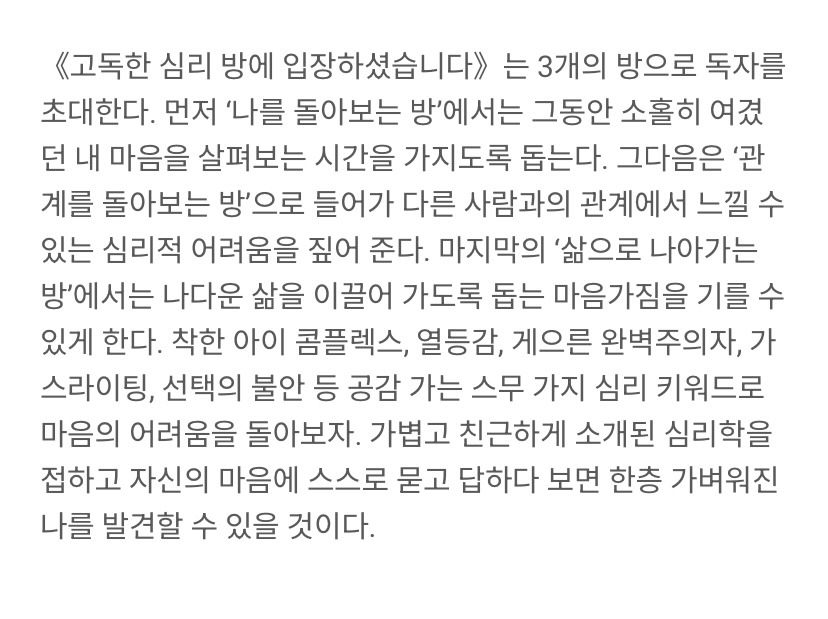 내가 '나'로 살아가지만, 정작 '나'에 대해 잘 모를 때가 많습니다. '나'는 어떤 마음을 가지고 있는지, 무엇을 원하는지 말이죠. 때로는 세상에 맞추며 사느라 나의 마음을 무시할 때도 있습니다. 그럴 때마다 괜히 작아지는 것 같은 기분을 느끼기도 하지요. 이 책은 다양한 심리 개념을 만화와 글, 워크시트를 통해서 내 마음을 바라볼 수 있도록 쓰였습니다. 내가 나를 바라보고 보살피며 보다 온전한 나의 삶을 살아갈 수 있도록 돕지요. 또한 평소 심리에 관심이 있었으나, 장벽이 높게 느껴졌던 분들도 친근한 만화를 통해서 쉽고 재밌게 즐길 수 있습니다. 착한 아이 콤플렉스, 열등감, 게으른 완벽주의자, 가스라이팅, 선택의 불안 등 공감 가는 스무 가지 심리 키워드로 마음의 어려움을 돌아보면 좋을 것 같습니다. 가볍고 친근하게 소개된 심리학을 접하고 자신의 마음에 스스로 묻고 답하다 보면 한층 가벼워진 나를 발견할 수 있을 것입니다.