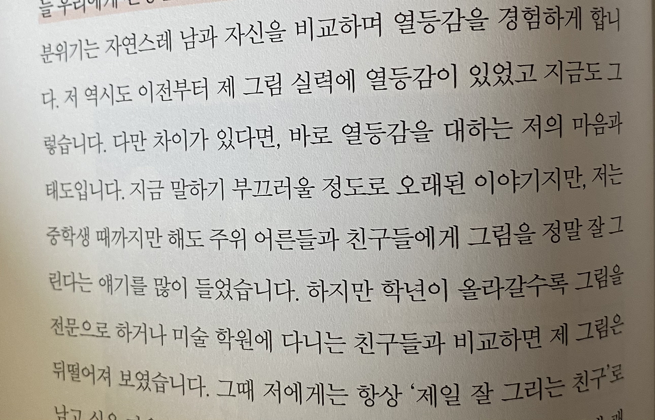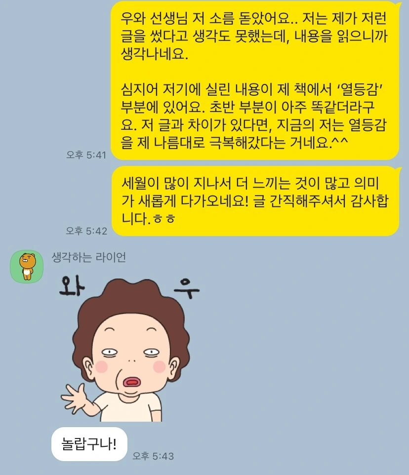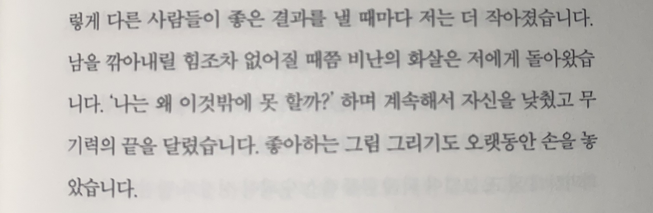 다만 글에서의 차이가 있다면, 그 시절의 글에는 열등감을 극복한 것이 아닌 자기 암시로 글을 마무리하지만, 지금의 책에서는 열등감을 바라보는 태도가 달라졌고 나름대로 열등감을 극복했다는 것으로 마무리됩니다.