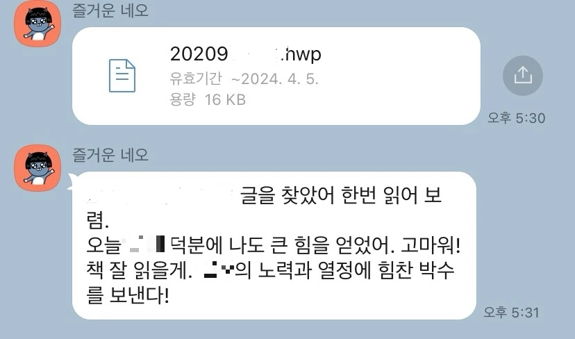 선생님과의 이런저런 깊은 대화 후에 헤어졌고, 시간이 얼마 지나지 않아서 카톡이 울렸습니다.