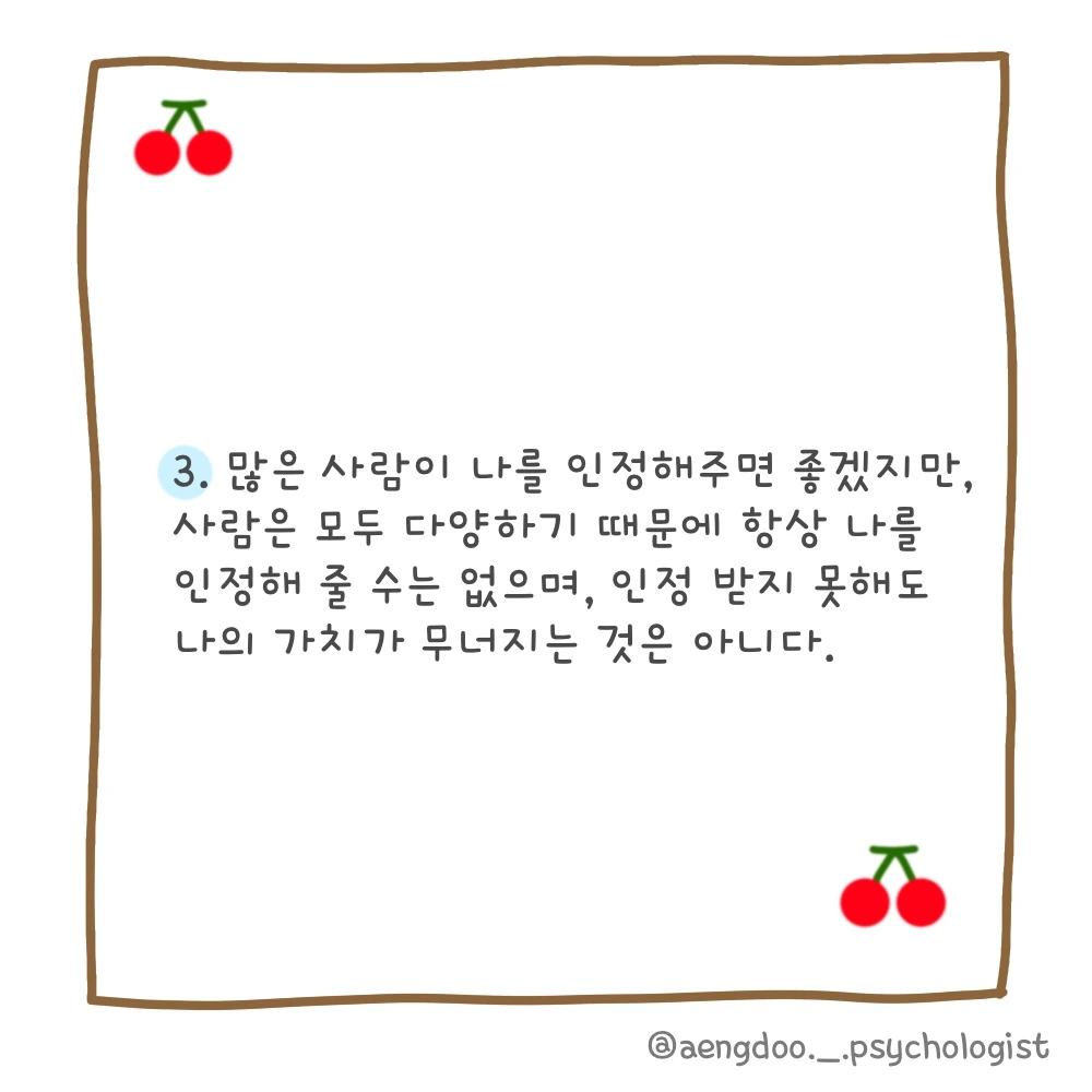 3. 많은 사람이 나를 인정해주면 좋겠지만, 사람은 모두가 다양하기 때문에 항상 나를 인정해 줄 수는 없으며, 인정 받지 못해도 나의 가치가 무너지는 것은 아니다.