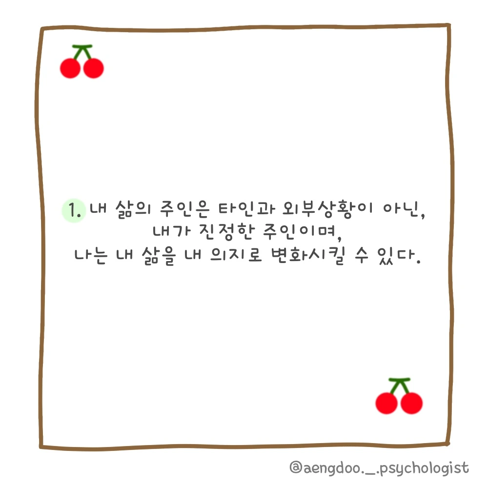 1. 내 삶의 주인은 타인과 외부상황이 아닌, 내가 진정한 주인이며, 나는 내 삶을 내 의지로 변화시킬 수 있다.