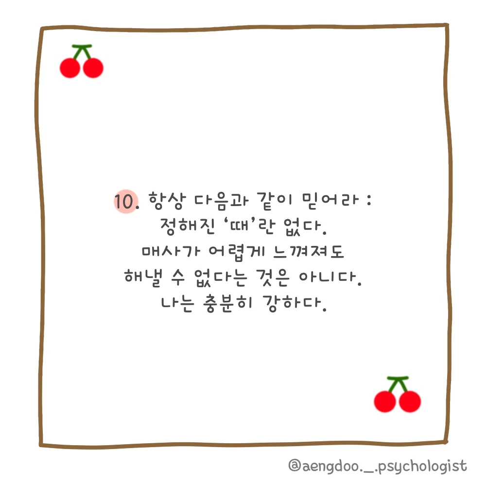 10. 항상 다음과 같이 믿어라: 정해진 ‘때’란 없다. 매사가 어렵게 느껴져도 해낼 수 없다는 것은 아니다. 나는 충분히 강하다.