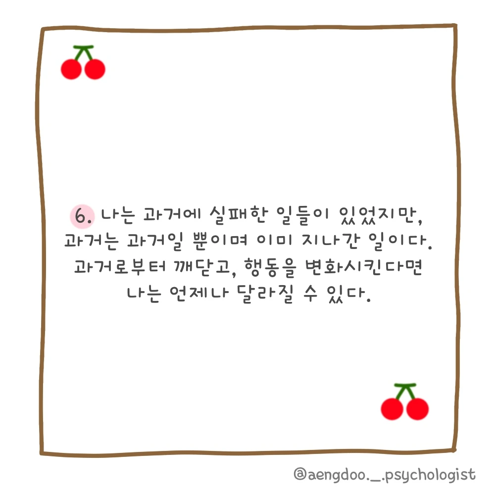 6. 나는 과거에 실패한 일들이 있었지만, 과거는 과거일 뿐이며 이미 지나간 일이다. 과거로부터 깨닫고, 행동을 변화시킨다면 나는 언제나 달라질 수 있다.