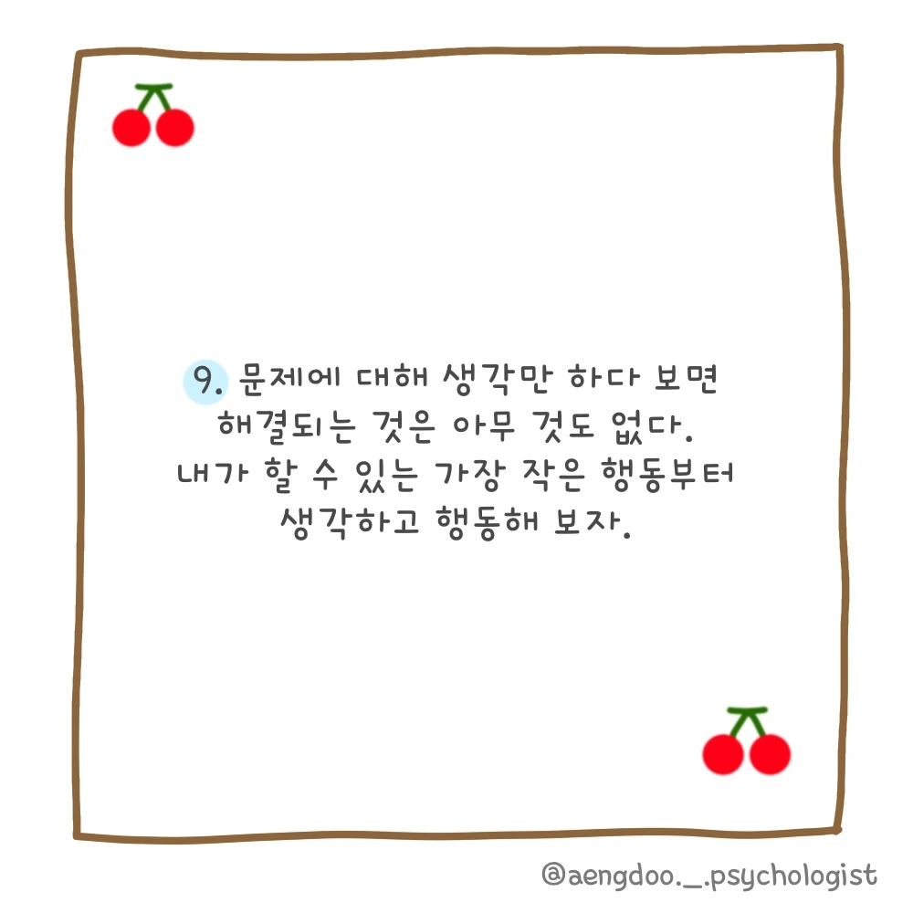 9. 문제에 대해 생각만 하다 보면 해결되는 것은 아무 것도 없다. 내가 할 수 있는 가장 작은 행동부터 생각하고 행동해 보자.