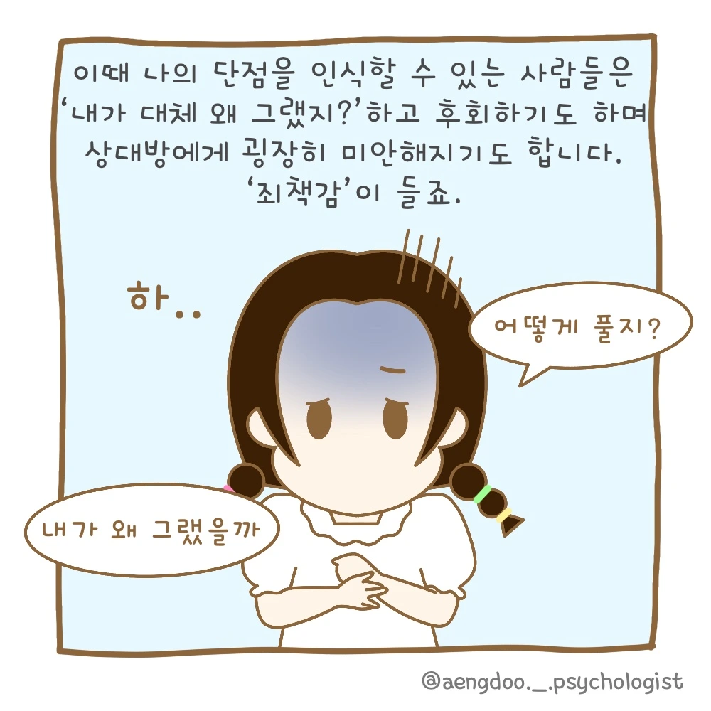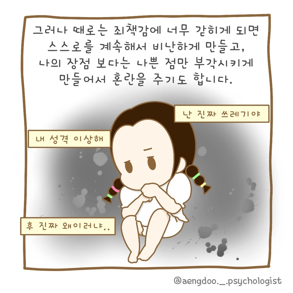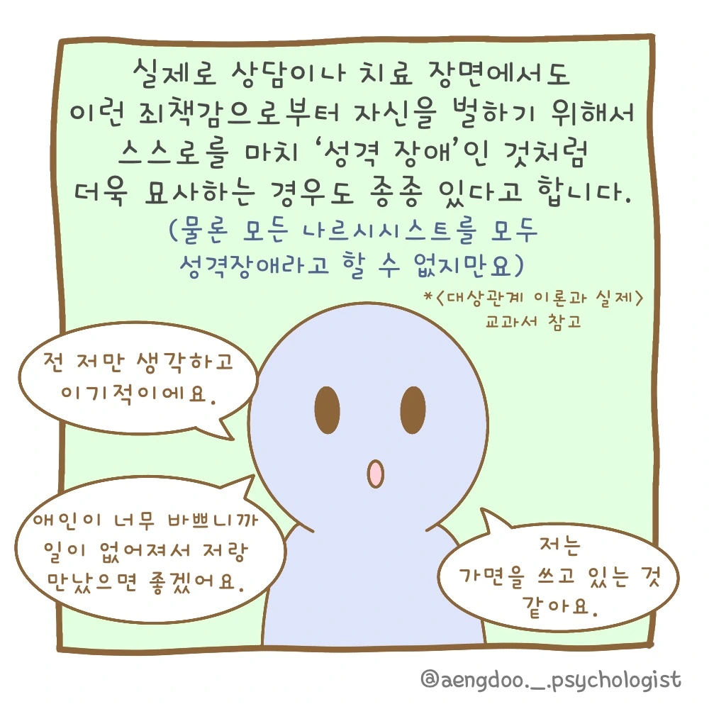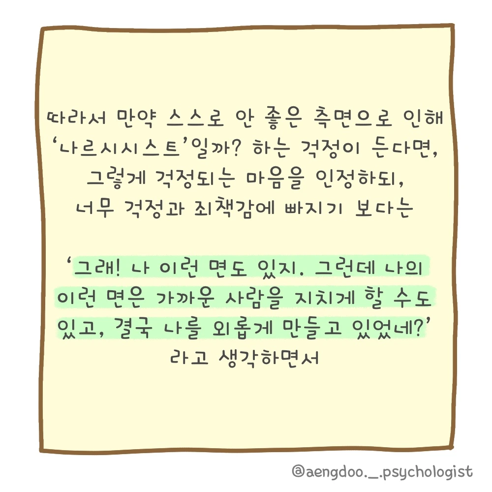 스스로가 나르시시스트면 어쩌지? 하는 걱정이 든다면 그건 아마도 우리 안에 있는 죄책감으로 인해 그럴 수도 있습니다. 이런 죄책감은 나를 더욱 양심적으로 살 수 있게 만드는 좋은 역할을 해주기도 하지만, 반대로 너무 죄책감에 빠져 있으면 내 장점을 가려버리기도 하죠. 따라서 죄책감은 인정 하되, 너무 빠지지 않고 변화를 위해 조금씩 나아가는 모습이 더욱 더 좋지 않을까 생각됩니다.