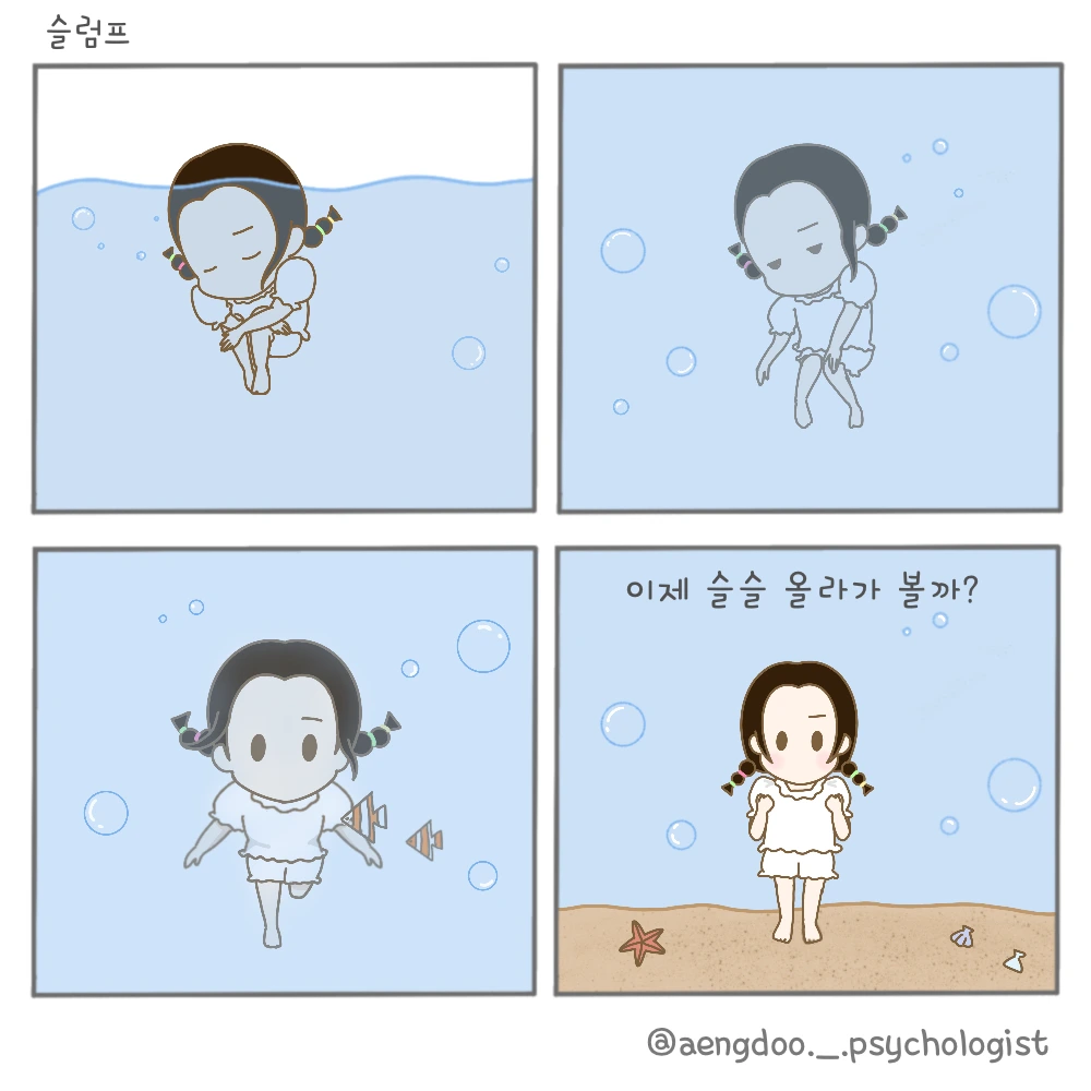 슬럼프가 왔다는 것은 어쩌면 잠시 쉬어가라는 신호일지도 모른다. 그동안 수고한 당신에게 휴식이 필요하다는 것을 알리는 삐딱한 신호라고 생각하자. 앞으로 슬럼프는 인생을 살면서 몇 번이든 당신을 빠트릴 것이다. 하지만 당신은 언제나 몇 번이고 당신만의 방법으로 헤엄쳐 다시 올라갈 것이다. 그럴 때마다 당신을 인정해주며 앞으로 슬럼프가 다시 찾아왔을 때도 온전히 받아들여보자. 슬럼프가 왔다고 해서 너무 당황하거나 겁먹지 말자. 슬럼프가 왔다는 것은 그만큼 당신이 열심히 살고, 노력해왔다는 증거이기도 하니까.