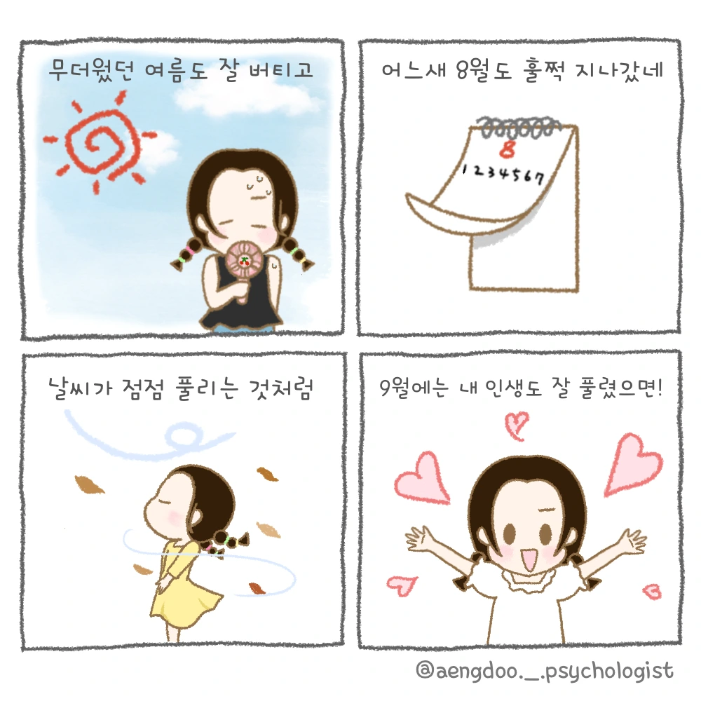 이런 9월을 맞이하면서 머릿속에는 어떤 생각 하나가 자리 잡았다. 풀려가는 날씨처럼 9월에는 ‘내 인생도 잘 풀렸으면.’ 하는 생각 말이다. 동시에 선선해지는 9월 가을바람에 괜스레 용기가 생겼다. 그런 의미에서 9월은 어떤 것을 다짐하고 도전하기에 좋은 달인 것 같다.