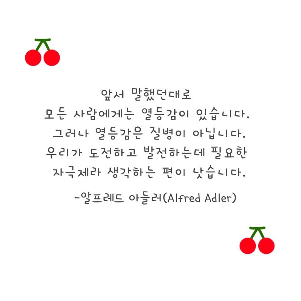 질투를 할 때마다 제 마음이 불편한 이유가 있었다는 걸 심리학을 통해 알게 되었네요. 그저 마냥 그런 마음이 불편하기만 했는데 아들러의 열등감을 바라보는 관점은 저에게 흥미롭고 새롭게 다가왔고 이런 마음을 인정하자 마음이 편해지기도 했답니다! 마냥 불편하고 좋지 않은 감정이라고 생각했는데, 그 불편함이 오히려 성장의 계기가 될 수도 있더라구요..^^