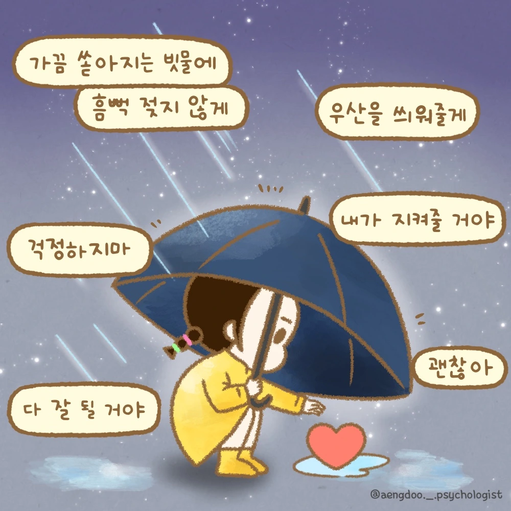 그런데 문득, 이런 생각이 들었어요. 오늘처럼 비가 오는 날씨에 우산을 써서 나를 보호할 수 있듯이, 내 마음에도 비가 오면 우산을 씌워줄 수 있었으면 좋겠다는 생각이요.