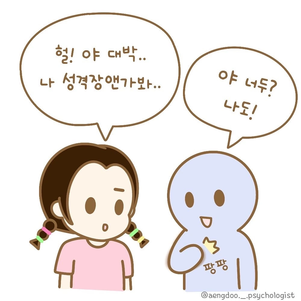실제로 전공생들이 성격장애에 대해 공부할 때 가장 많이 하는 생각입니다. 수업이 끝나면 다 같이 삼삼오오 모여서 “헉! 이거 나 아냐?”, “이거 난 줄” 하면서 담소를 나누기도 했답니다.