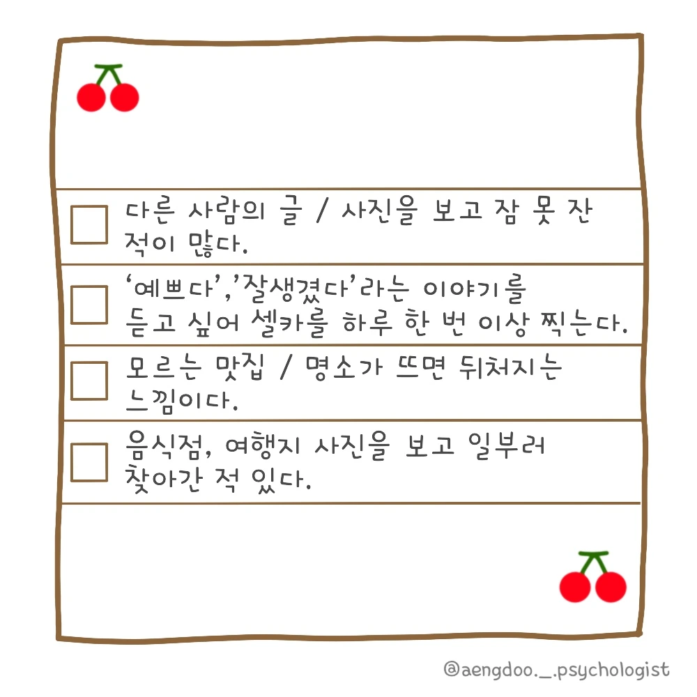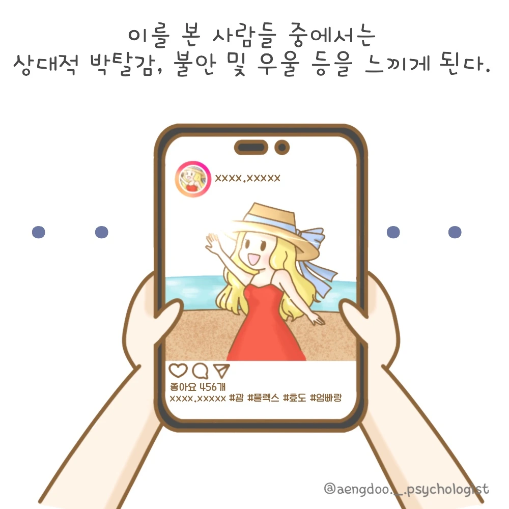 SNS가 중심이 된 요즘 시대에서는 많은 사람들이, SNS를 통해 다른 사람들의 삶을 엿보면서 상대적 박탈감을 많이 느낀다고 합니다. 이로 인해서 자신의 삶이 초라해 보이고 우울현상까지 겪는다고 하는데요, 저 또한 SNS로 글을 올리고 있는 입장으로서 많이 공감되었답니다.