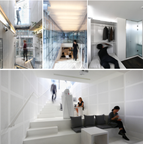 마이크로 하우징은 방의 크기나 개수, 공간의 용도 등이 일정하게 고정된 기존 주택(오피스텔, 원룸)이나 공간을 함께 쓰는 하우스 메이트와는 전혀 다른 모델이다. 빠르게 변화하는 라이프스타일을 반영한 주거 방식 즉, 공간이 유연하게 대응할 수 있도록 전이 공간*을 충분히 마련하여 지었다는 점이 특징이다. 예를 들어, 개인 공간을 합쳐 더 크게 만드는 게 가능하다. 또한, 버려지는 복도나 비상 계단실과 같은 유휴공간을 영화를 보거나 회의를 할 수 있도록 기능을 추가해 공간의 활용 범위를 넓혔다. 특히, 1인 거주자가 방안에 고립되는 것이 아닌 안팎으로 활발히 이동하며 독립적이면서도 연결되는 유연한 생활을 하도록했다. 이는 프라이버시 범위를 거주자가 결정하도록 선택권을 주어, 경제 논리에 의해 쉽게 희생될 수 있는 거주자의 삶의 질을 높인 것이다.