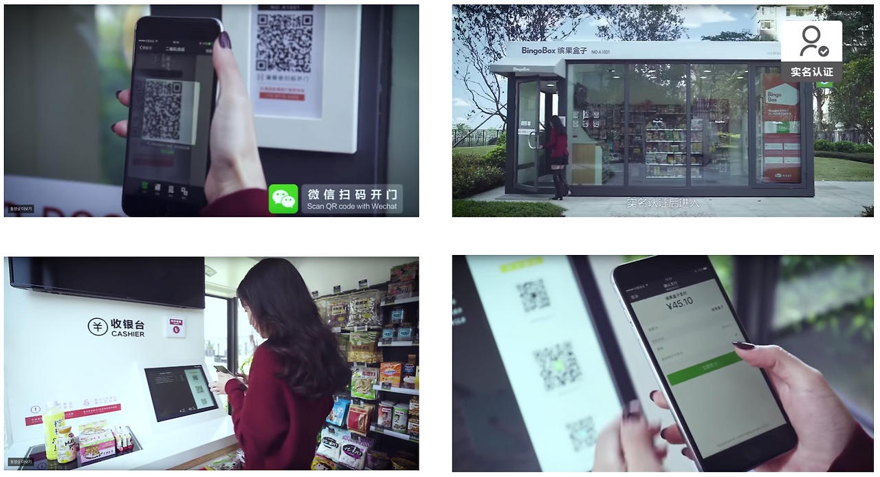 아마존은 지난해 본사 근처에 인공지능, 센서, 카메라 기술을 사용해 자동 결제되는 무인 상점 아마존 고를 선보인 바 있는데, 중국이 발빠르게 이에 맞서 개발한 무인 상점이 빙고박스라고 할 수 있다. 상하이를 포함한 일부 도시에는 12개의 무인 상점 빙고 박스(BingoBox)가 운영 중이다.기술적인 면에서는 부족하지만 아마존이 시범 운영 중인 반면 실제 운영을 하고 있으며. 알리 페이와 위챗 페이를 지원한다.