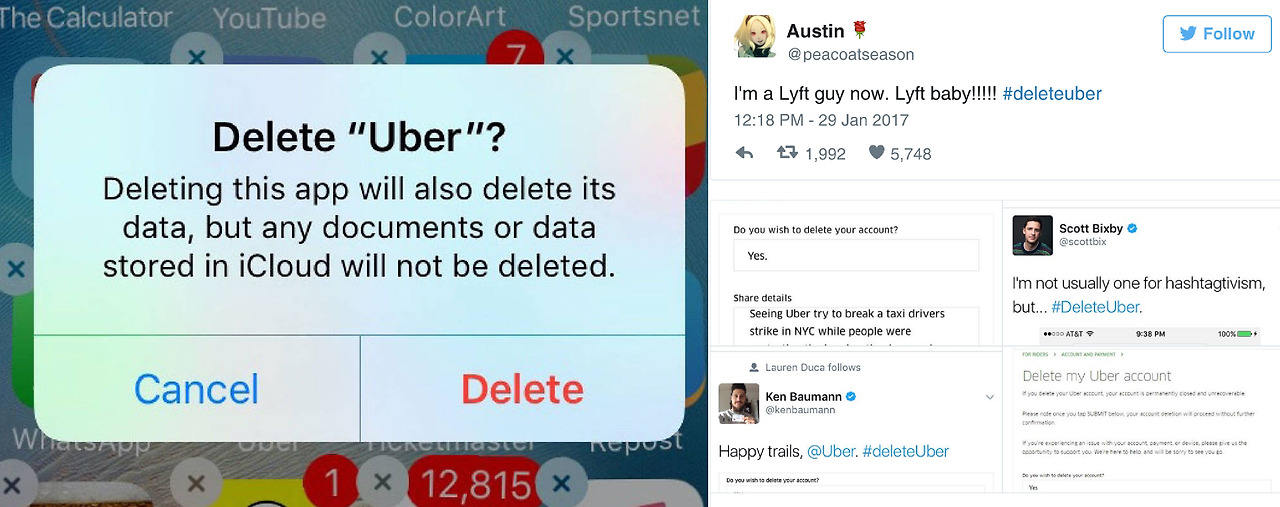 그런데 이제 브랜드의 '보여주기'로는 부족해보인다. 소비자는 경영자에게도 올바른 신념을 검증하려 한다. 최근 브랜드 CEO의 정치적 성향에 따라 브랜드 이미지가 널뛰기 하는 몇 가지 사건이 일어났다. 먼저 지난주 미국에서는 세계1위 차량호출기업 우버(Uber)의 CEO 트래비스 캘러닉(Travis Kalanick)이 도널드 트럼프의 자문단으로 참여하고 있다는 사실이 알려졌다. 그 후 우버 고객 20만명이 동시다발적으로 우버계정을 삭제했다. 우버를 향한 비판 여론이 고조되며 SNS에서는 #DeleteUber 해시태그 운동까지 등장했다. 이로 인해 만년 2위를 달리던 차량호출업체 기업 리프트(Lyft)가 주목 받기 시작했다. 리프트 CEO는 여세를 몰아 미국시민자유연맹(ACLU)에 1백만 달러를 기부하고 있다고 밝혔고, 이로 인해 리프트는 순식간에 앱스토어 무료여행 카테고리 앱 차트 1위에 올랐다. 뿐만 아니다. 트럼프의 반이민 정책 발표 이후, 스타벅스 CEO는 만명의 난민을 고용하겠다고 약속했고, 에어비앤비의 브라이언 체스키는 난민에게 무료로 집을 제공하겠다고 발표했다.