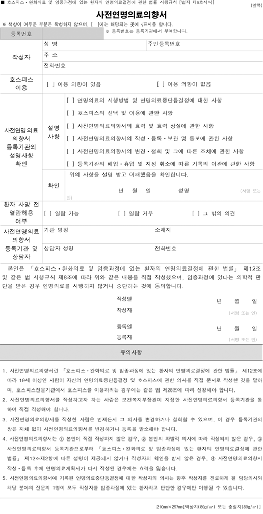 19세 이상의 사람은 누구나 자신이 향후 임종과정에 있는 환자가 되었을 때를 대비하여 연명의료 및 호스피스에 관한 의향을 문서로 작성해 둘 수 있다.
