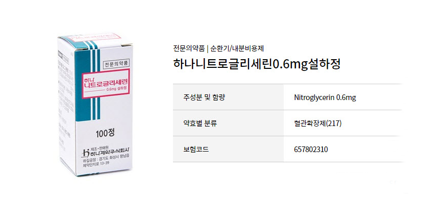 - 급성 협심증 발작 발생 시 1회 1정을 설하(혀 아래에 투여)