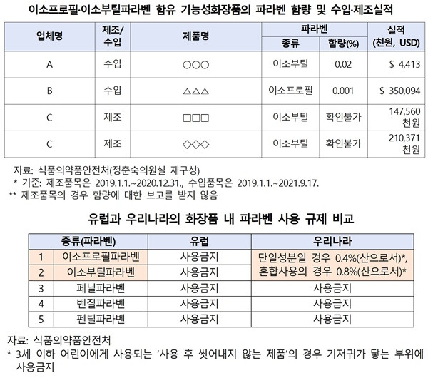 미국 화장품원료검토위원회(CIR)에서는 1984년에 메틸파라벤, 프로필파라벤, 부틸파라벤의 안전성을 검토한 후 최대 25% 수준까지 화장품에 사용해도 안전하다는 결론이 나왔다.