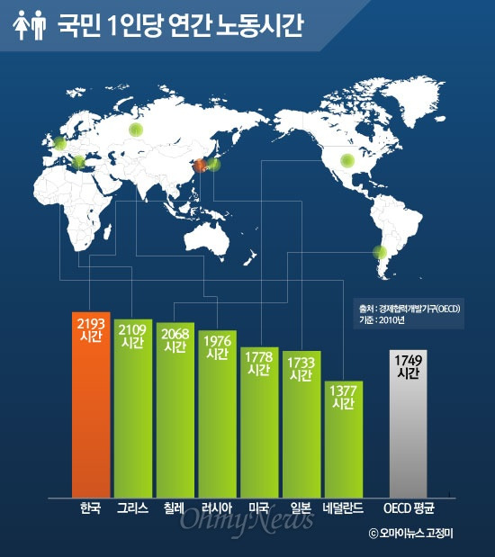 일할 수 있도록 되어있어서 연봉 협상 시 연장 근로 시간을 포함시키는 등 경제협력개발기구(OECD)에서 집계한 고강도 노동 시간 국가에 한국은 멕시코, 코스타리카와 유사한 그룹에 포함될 정도로 과로를 시키고 있다. 육체적이든 정신적이든 고된 노동을 끝낸 사람들이 휴식을 취하고 긴장을 풀고 해소하기 위한 방법으로 술을 찾는 건 너무 당연하다.