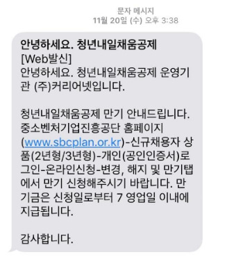 회사와 정부 분담급 납입이 완료되면, 문자가 온다. 만기금 신청을 할 수 있다고. 그러면 재빨리 홈페이지에서 들어가서 신청을 하면 된다. 물론 난 이 문자를 받기 전에 신청을 했다. 이미 매일매일 확인하고 있었기에^^ 그러면 영업일 기준 7일 이내에 돈이 입금된다.