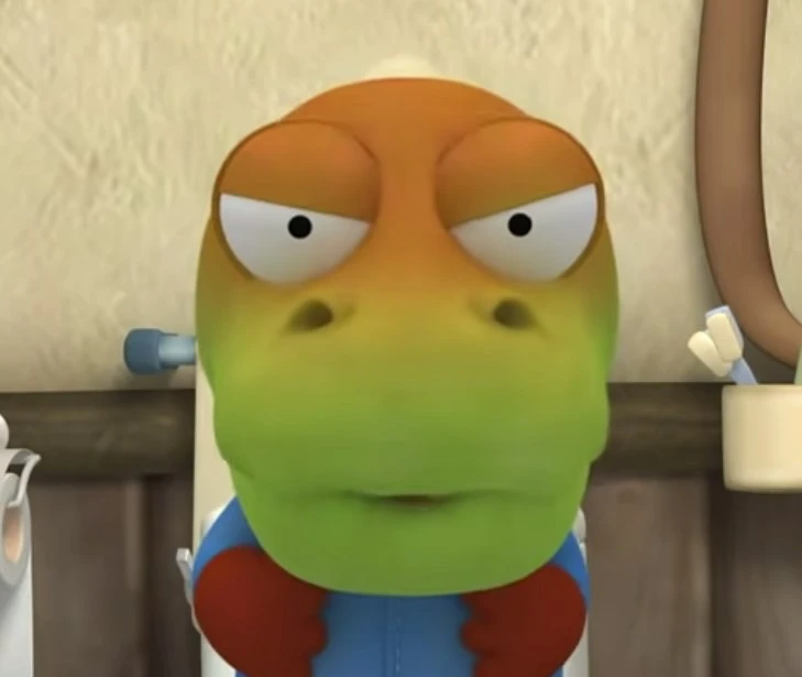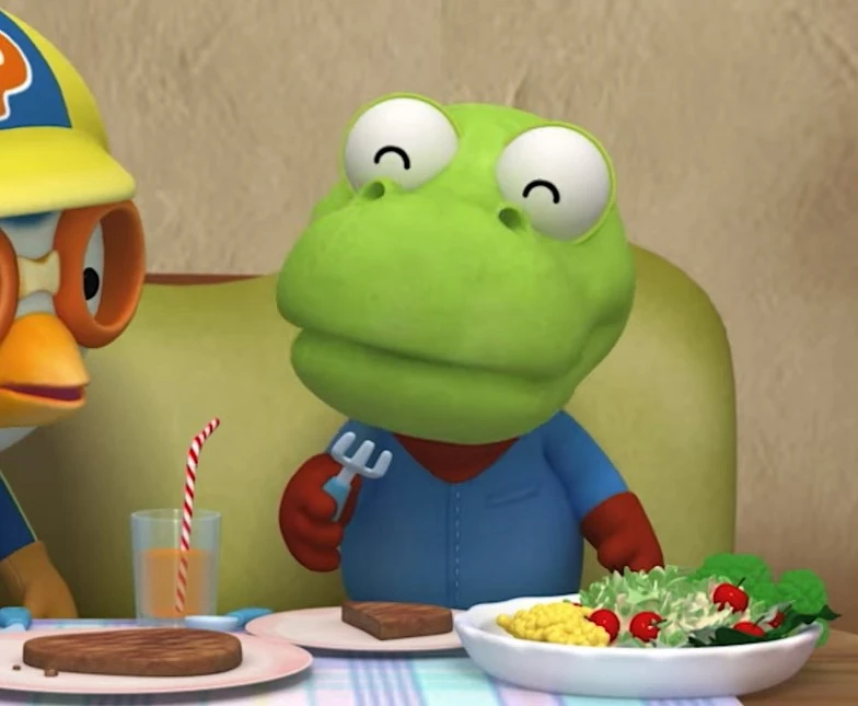 초식인 크롱이는 채소는 쳐다보지도 않고 스테이크를 먹는데, 아직 진화가 덜 되었는지 배탈이 난 모습 같다.