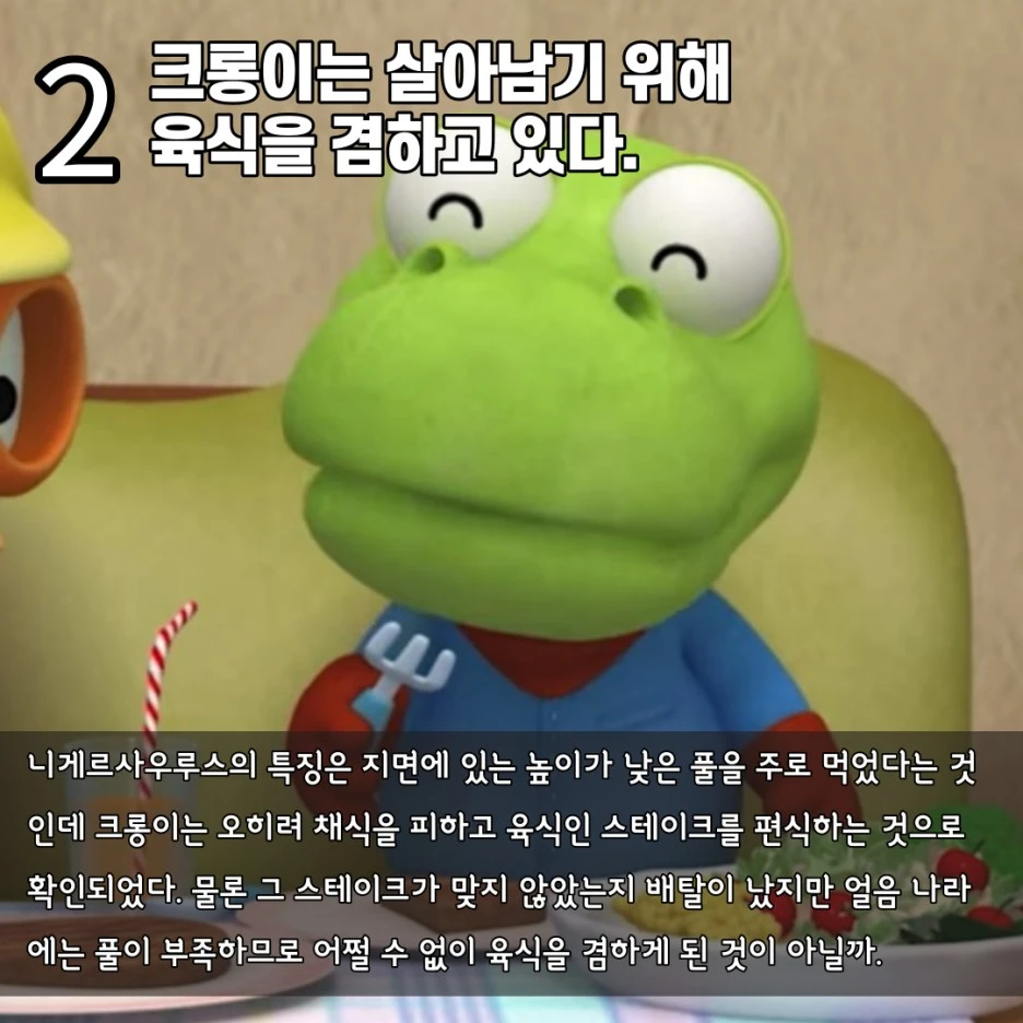 심지어 크롱이는 육식이 더 좋은지 옆에 있는 채소는 쳐다보지도 않고 스테이크만 먹었는데요. 아직 완전한 잡식으로의 진화가 잘되지 않았는지 배탈이 난 모습도 확인됩니다. 어쨌거나 크롱이는 척박한 환경에 적응하기 위해 스스로 육식을 겸하도록 진화한 것으로 보이며 그로 인해 씹는 힘이 약한 니게르 사우루스보다 턱힘도 발달한 것으로 보입니다.