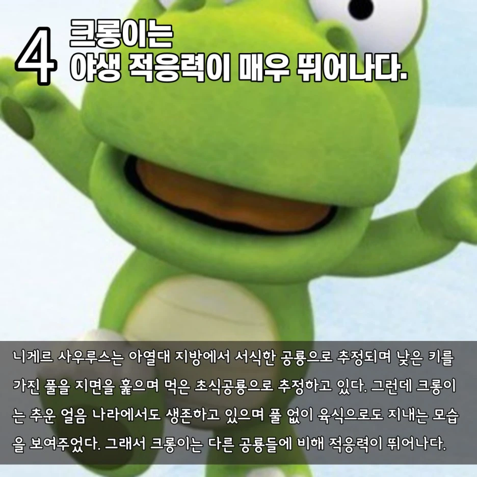 니게르 사우루스는 아열대 지방에서 서식한 공룡으로 지면에 있는 풀을 먹으며 산 공룡입니다. 씹는 힘은 약해서 부드러운 풀 위주로 먹었을 것이고, 후각은 약해서 다양한 먹이를 먹지도 못했을 것으로 추측되죠. 그런데 크롱이는 다른 니게르 사우루스들과는 고기도 먹을 수 있으며 다르게 고기도 씹을 정도로 턱 힘이 있으며 먹이가 부족한 얼음 나라에서도 행복하게 살고 있습니다. 또한 아열대에서 서식한 니게르 사우루스가 얼음 나라에 간다면 분명 저체온으로 고생했을 텐데 크롱이는 불편함 없이 잘 살고 있습니다. 즉 크롱이는 일반적인 니게르 사우루스보다 더 추운 곳에서도 살 수 있고 더 다양한 먹이도 먹을 수 있습니다. 그래서 크롱이는 적응력이 매우 뛰어나며 야생에서도 스스로 훌륭히 생존할 수 있을 것으로 보입니다. 크롱이가 만약 공룡 시대에서 살았다면 크롱이의 자손은 번성해서 전 세계 전역에서 관찰되었을 수도 있겠네요.