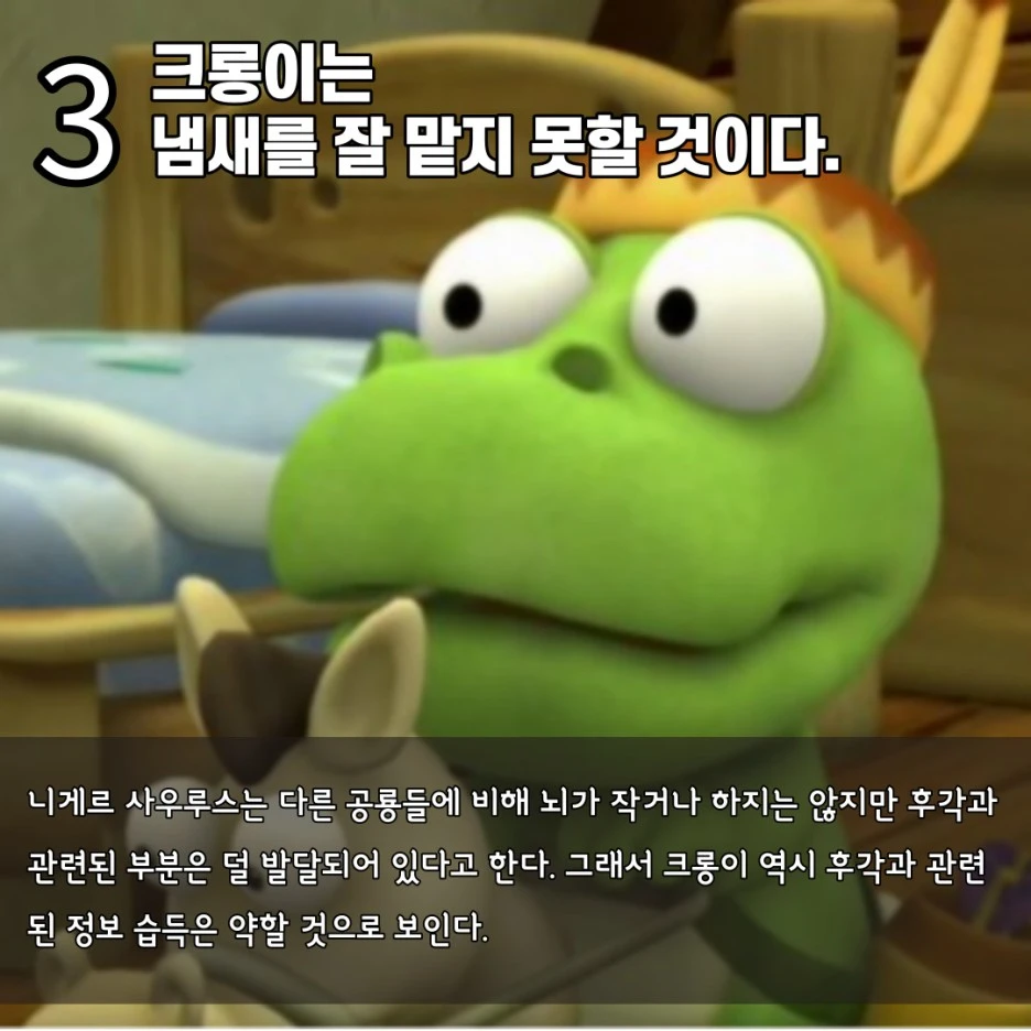 니게르 사우루스는 다른 공룡들에 비해 뇌는 평범합니다. 다만 후각과 관련된 부분은 덜 발달되어 있다고 합니다. 공룡의 후각이 어느 정도인지는 사실 알 수 없으나 일반적인 공룡보다는 후각이 덜 발달되었을 것으로 추정합니다. 니게르 사우루스의 경우 지면에 있는 풀만 먹으면 되었기에 후각의 발달이 그다지 필요하지 않았던 것으로 보이네요. 크롱이도 다른 공룡들에 비해 후각이 약할 것으로 보입니다. 다만 먹이를 찾기 쉽지 않은 얼음 나라에서 후각이 발달되지 않는다면 생존하기 힘들기에 크롱이는 뽀로로의 보살핌이 반드시 필요할 것으로 보이네요.