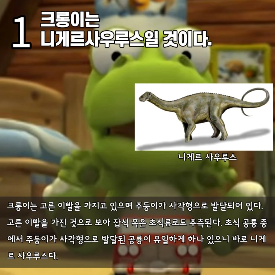 크롱이는 니게르 사우루스로 추정되며 살기 위해 육식을 겸하게 되었고 냄새를 잘 맡지는 못하지만 다른 니게르 사우루스들에 비해 환경 적응력이 매우 뛰어날 것으로 저는 추측하였습니다. 크롱이는 지금 아기 공룡으로 뽀로로 친구들 사이에서 가장 작지만, 나중에 크롱이가 성장하게 된다면 북극곰인 포비보다 훨씬 더 크게 자랄 것입니다. 그나마 초식이라서 다행이긴 하지만 뽀로로는 지금 크롱이를 너무 괴롭히지 않는 게 좋을 것 같네요. 나중에 크롱이가 성장하면 9m까지 클 테니까요.