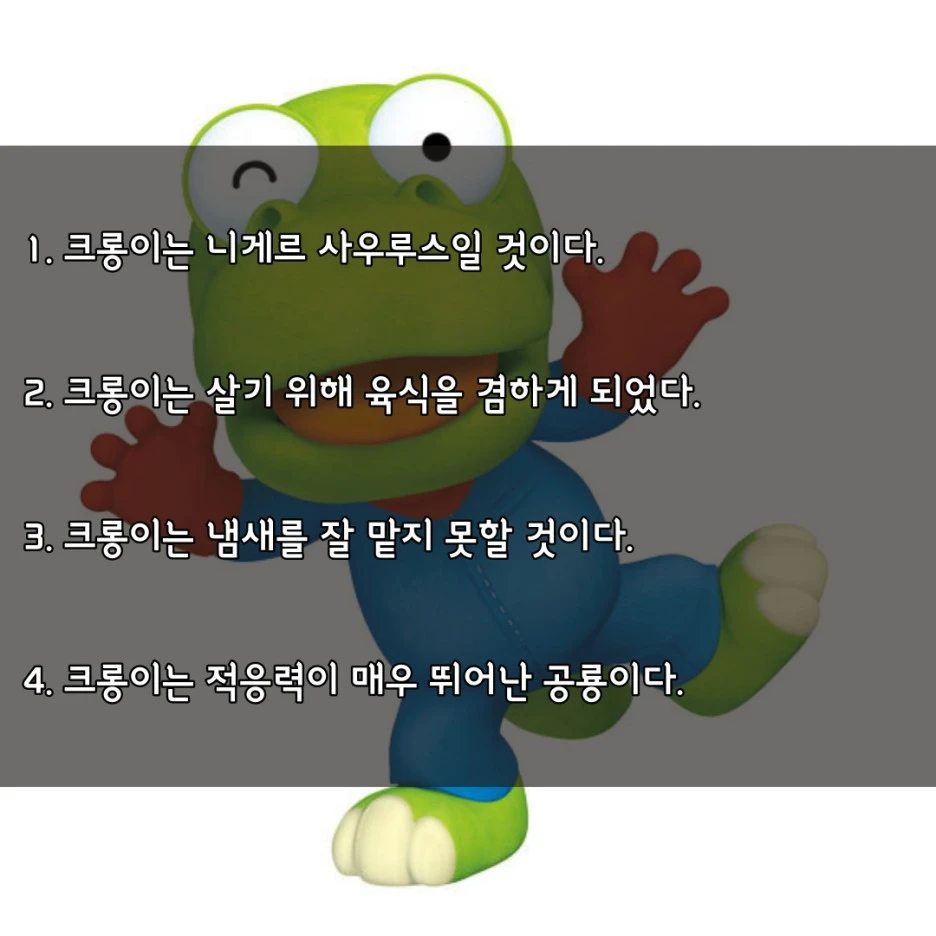 뽀로로를 모르는 사람이 있을까요? 뽀로로는 우리나라뿐만 아니라 전 세계적으로 유명한 캐릭터가 되었습니다. 전 세계의 아이들의 울음을 그치고 전 세계의 부모들의 육아를 도와주는 아주 고마운 캐릭터죠. 이번에는 뽀로로의 단짝 친구 크롱이를 분석하고자 합니다. 크롱이는 뽀로로가 집에서 가져온 알에서 태어난 공룡이라는 설정이 있는데, 아직 어려서 말을 못 하는 특징이 있습니다. 외형으로만 봐선 악어인지 공룡인지 논란이 많은데요. 공식적으로는 공룡이라는 설정입니다. 그런데 크롱이가 어떤 공룡인지에 대해선 여러 의견이 많은데요. 사실 저도 공룡에 대해선 거의 모르지만 지금까지 나온 가설들을 찾아보며 크롱이가 어떤 공룡인지에 대해 분석하였습니다. 과연 크롱이는 어떤 공룡일까요?
