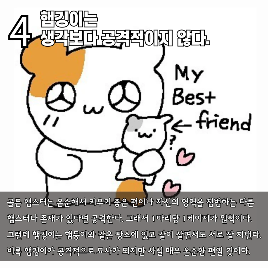 햄깅이는 종종 공격적인 모습을 보여줍니다. 하지만 저는 햄깅이가 공격적인 모습을 보여주지만 사실은 온순하고 온화한 성격으로 보고 있습니다. 골든 햄스터는 비록 사람의 손을 타서 사람에게는 온순하지만 자신의 영역을 침범하는 다른 햄스터나 존재가 있다면 공격하며 심지어 물어 죽이기도 합니다. 그래서 1마리당 1케이지가 원칙인 햄스터입니다. 그런데 햄깅이는 햄둥이와 같은 장소에 있고 같이 살고 있는 것 같은데도 햄둥이를 소중히 대합니다. 햄깅이는 겉으로는 공격적인 척을 하지만 뒤에선 다른 친구들과 잘 지내는 츤데레 모습을 가진 온화한 골든 햄스터로 보입니다.