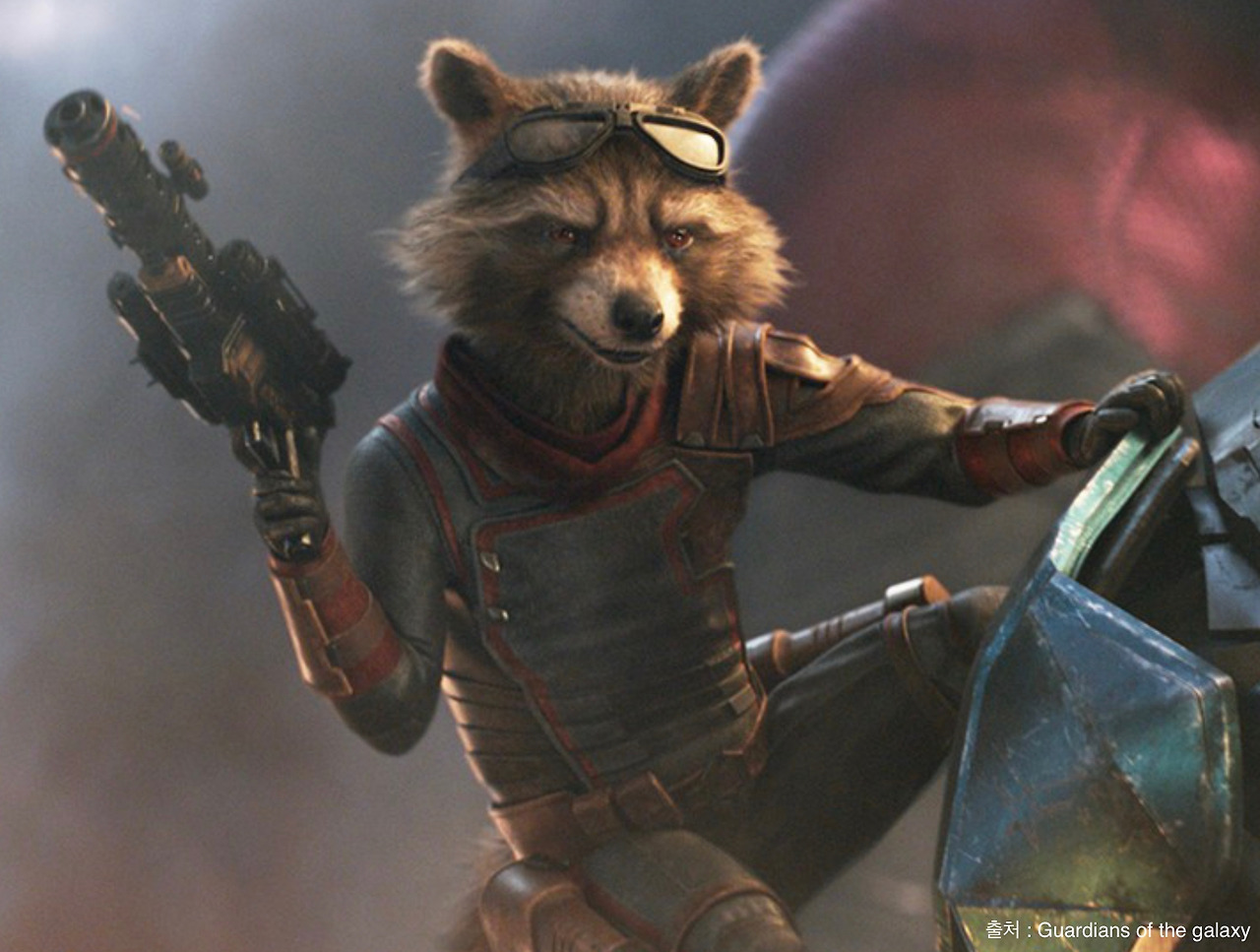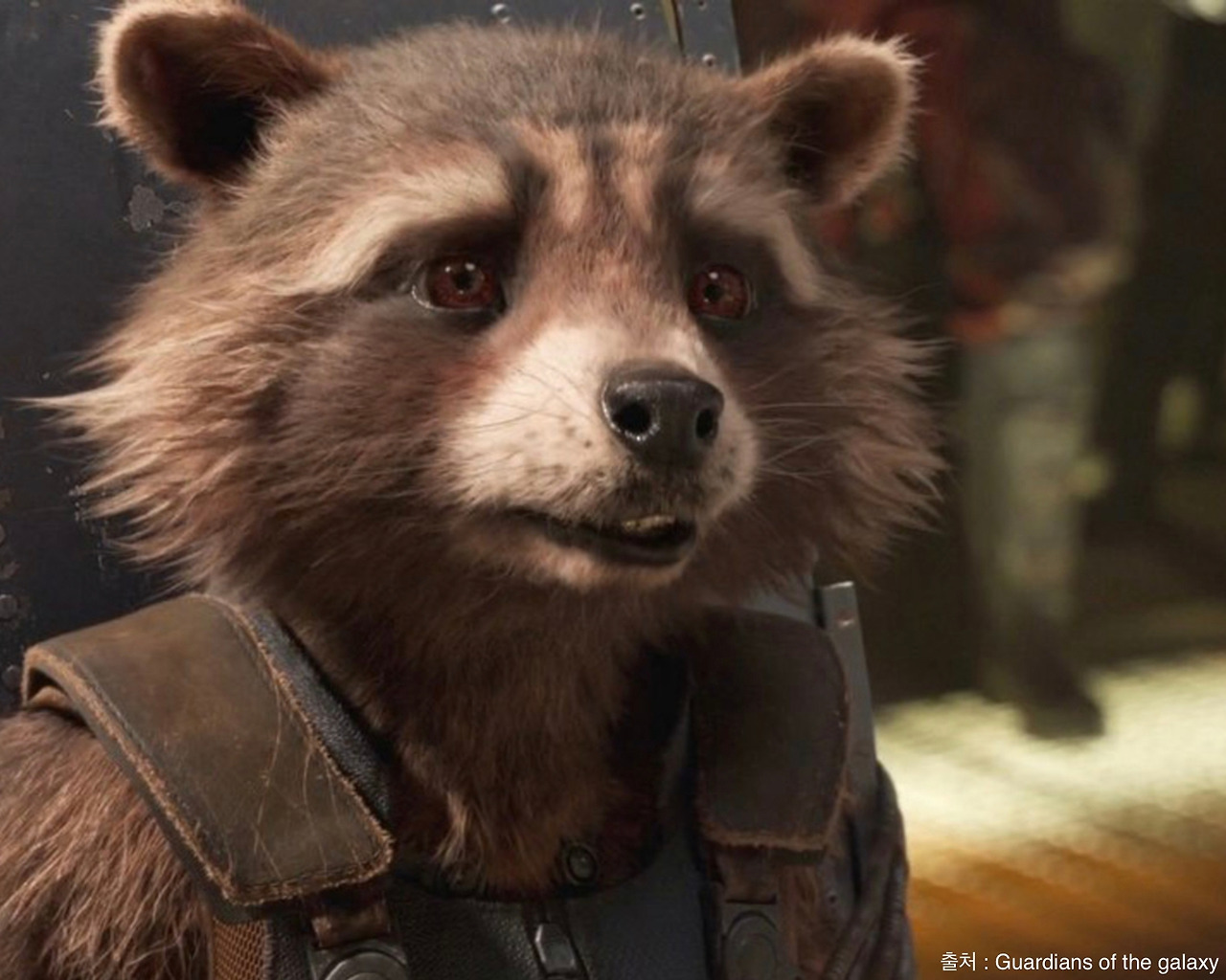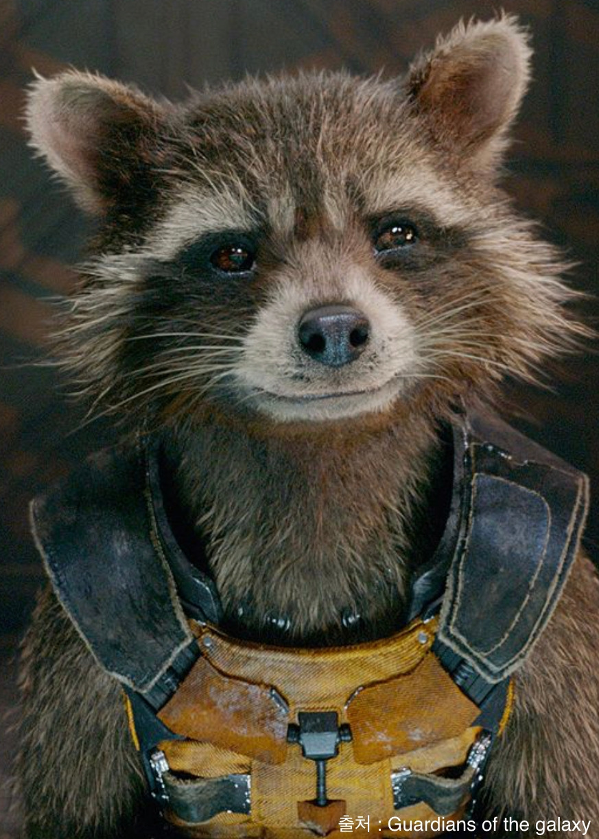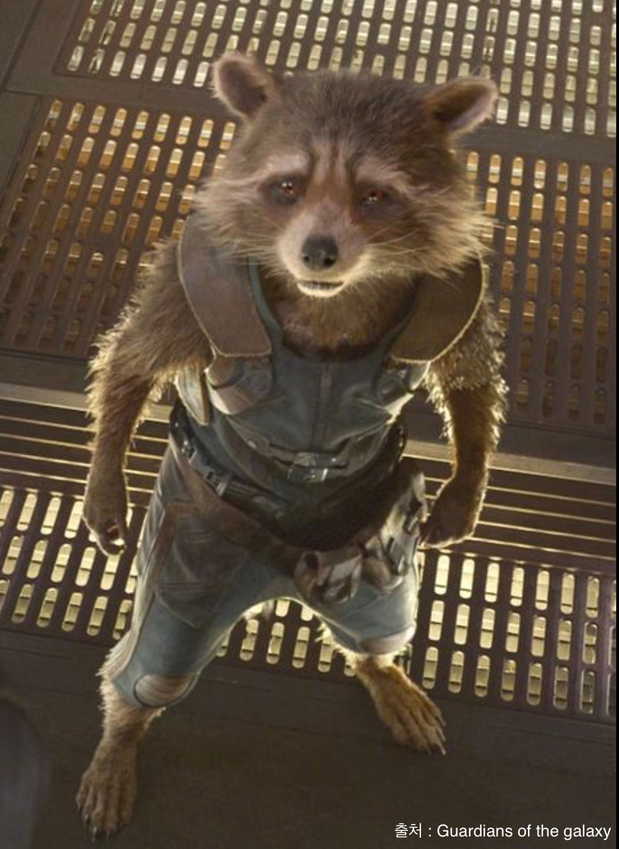 이번 17화에서는 마블 시리즈의 캐릭터를 한 번 건드려 보고자 합니다. 마블 시리즈에서 유일하게 동물로 등장하는 히어로인 로켓 라쿤(본명 89p13)에 대해서 알아보고자 합니다. 로켓이 라쿤인지는 명확하게 밝혀지지는 않았으나 촬영할 때는 실제 라쿤을 데리고 촬영을 했으니 로켓이 라쿤인 것은 어느 정도 사실인 것 같습니다. 작중 로켓은 동물의 유전자 변형 실험을 통해 생긴 결과물로 일반적인 동물보다 단단해진 골격과 뛰어난 뇌 기능을 가지고 있다고 설명하고 있습니다. 따라서 이번 로켓을 분석할 때 좀 더 똑똑한 라쿤임을 가정하고 분석해보고자 합니다.