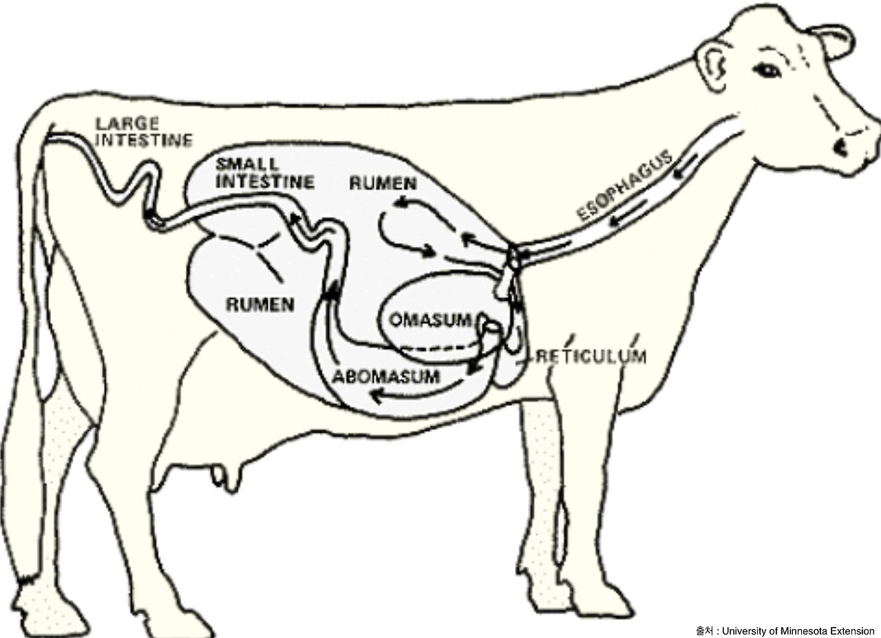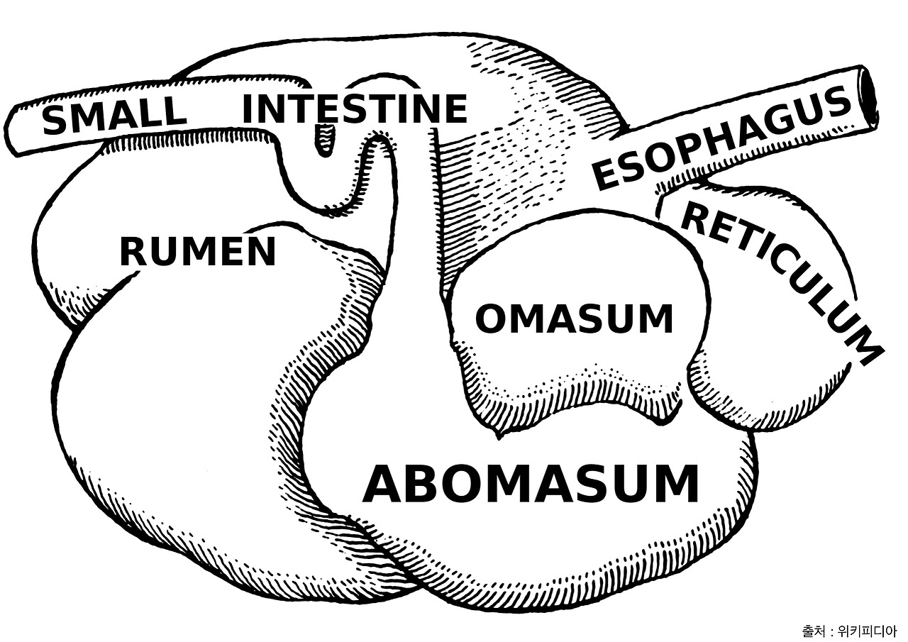 소는 사람과는 다르게 위(stomach)는 4개입니다. 제1위(Rumen)은 반추위 혹은 양곱창으로 불리며 위 중에서 면적이 가장 커 70-80% 정도를 차지하고 많은 수의 미생물이 사는 특징이 있습니다. 제2위(Reticulum)은 벌집위로 표면이 벌집처럼 되어 있습니다. 혹은 이물질을 그물로 거르듯 하다 하여 그물위라고도 합니다. 실제로 벌집위에서는 이물질을 거르는 역할을 합니다. 제3위는 겹주름위(Omasum)로 천 개의 잎사귀가 붙은 것 같다 하여 천엽이라고 부르며 잔주름이 많은 것이 특징입니다. 마지막 제4위(Abomasum)는 주름위라고도 불리며 흔히 막창이라고 불리는 부분으로 우리 사람의 위와 같은 기능을 하는 곳입니다. 소가 만약 풀을 먹게 된다면 식도를 통해 제1위로 들어간 뒤 제2위에서 입으로 올려 보내어 되씹는 과정을 거치는데 이를 반추(Rumination)라고 하며 이러한 활동을 하는 동물들을 반추동물(Ruminant)이라고 합니다.