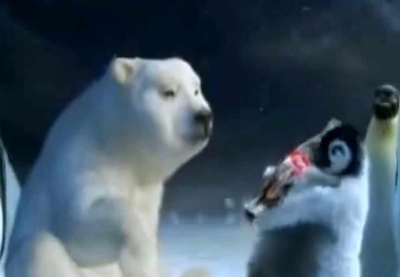 2005년의 코카콜라 크리스마스 에디션 광고를 보면 펭귄과 북극곰이 서로 같은 장소에서 콜라를 나눠마시는 낭만적인 장면이 나옵니다. 그러나 이러한 장면은 현실에서는 불가능합니다. 북극곰은 반드시 북극에만 존재하고 있으며 펭귄은 북극에는 존재하지 않습니다. 같은 추운 곳인데 왜 펭귄이 북극에는 살지 않을까 하는 의문을 가진 노르웨이의 한 학자는 실제로 펭귄들을 북극에서 자라도록 하였는데 그 펭귄들은 1년이 채 되지 않아 죽었다고 합니다. 비록 북극은 펭귄이 살기에는 환경적으로는 갖춰져 있으나 북극곰이나 북극여우와 같은 포식자가 너무 많은 관계로 북극에서 펭귄이 살아남기에는 힘들었을 것입니다. 저 장면은 우연히 펭귄들이 북극에 정착하려고 이주한 경우일 것이며 얼마 지나지 않아 북극곰과 같은 천적들에게 집단 전체가 위태로워질 것입니다. 그래서 펭귄들은 자신들이 가지고 있는 콜라를 바치면서 포식자인 북극곰으로부터 본인의 신변을 보호하고 있는 것은 아닐까 생각합니다.
