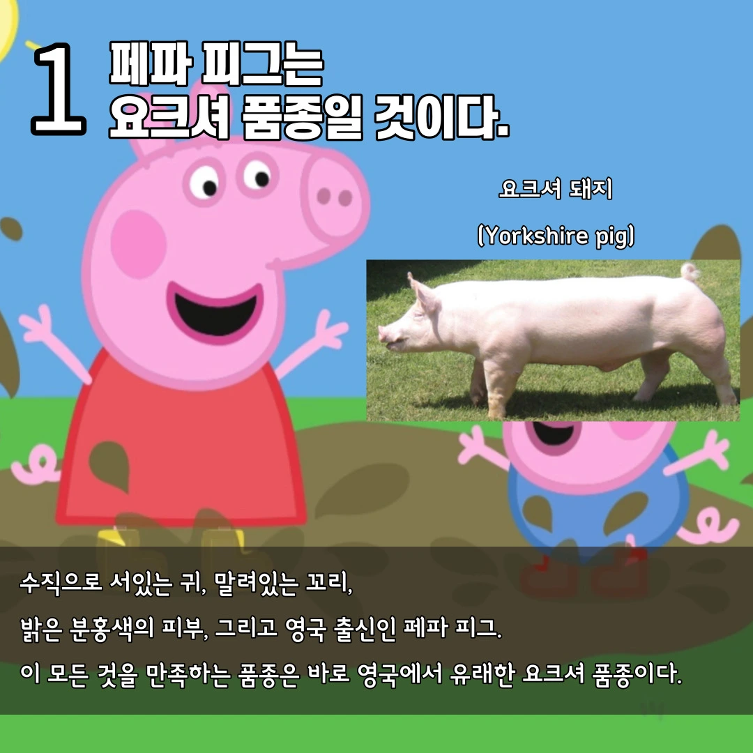 지금까지 페파 피그에 대해서 분석해보았습니다. 페파 피그는 요크셔 돼지로 앞발가락 하나가 퇴화되었으며 시야가 좁고 왜소증을 앓고 있을 것이라는 것이 제 결론이었습니다. 사실 돼지는 그 외에도 재밌는 사실들이 많습니다. 예를 들면, 강아지보다 똑똑하고, 감정을 느껴 슬퍼서 눈물을 흘릴 수도 있으며, 땀샘이 거의 없어 체온 조절이 힘들다는 점입니다. 또한, 우리 인간과 장기 구조가 매우 유사하여 장기 이식 연구에도 가장 활발히 도움을 주는 동물이기도 하기에 우리 인류는 이 돼지에게 정말로 고마워해야 할 것입니다.