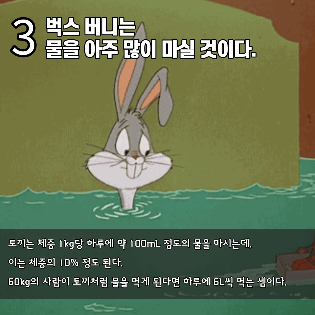 토끼는 체중 1kg당 하루에 약 100mL 정도의 물을 마시는데 이는 체중의 10%를 물로 마신다는 뜻입니다. 만약 60kg인 사람이 토끼처럼 물을 마신다고 가정하면 하루에 6L 이상 먹는 셈입니다. 토끼는 이처럼 체중에 비해 많은 물을 마시는데 그 이유는 다양합니다. 먼저 토끼는 많은 행동량을 가지고 있으므로 물을 많이 마시기도 하고, 더운 날씨 속에 적응하기 위해 땀샘이 없는 토끼는 체온을 조절하기 위해서도 물을 마시기도 합니다. 벅스 버니도 다른 토끼들과 마찬가지로 체중에 비해 상당한 양의 물을 마실 것이며 다른 토끼들보다 체격이 월등히 커 보이므로 어쩌면 사람보다 물을 더 많이 마실지도 모르겠습니다.