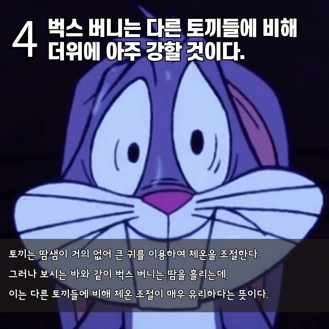 토끼는 땀샘이 거의 없습니다. 그렇다고 강아지처럼 혀를 내밀며 체온을 조절하지도 못하는데, 그래서 여름에는 큰 귀를 이용하여 체온을 낮춥니다. 하지만 토끼가 큰 귀가 있다고 하더라도 사람만큼 고온에서 체온을 조절하기는 쉽지 않아 열사병에도 종종 걸리기도 합니다. 벅스 버니는 충격적이게도 보시는 바와 같이 땀을 흘리는 것을 확인할 수 있는데, 그렇게 될 경우 벅스 버니는 다른 토끼들과는 다르게 출중한 체온 조절 능력이 있는 것이며 더운 날씨에 훨씬 더 잘 적응할 수 있을 것으로 생각됩니다. 비범한 유전자를 가진 벅스 버니는 부모님에게 정말 감사해야 할 것 같습니다.