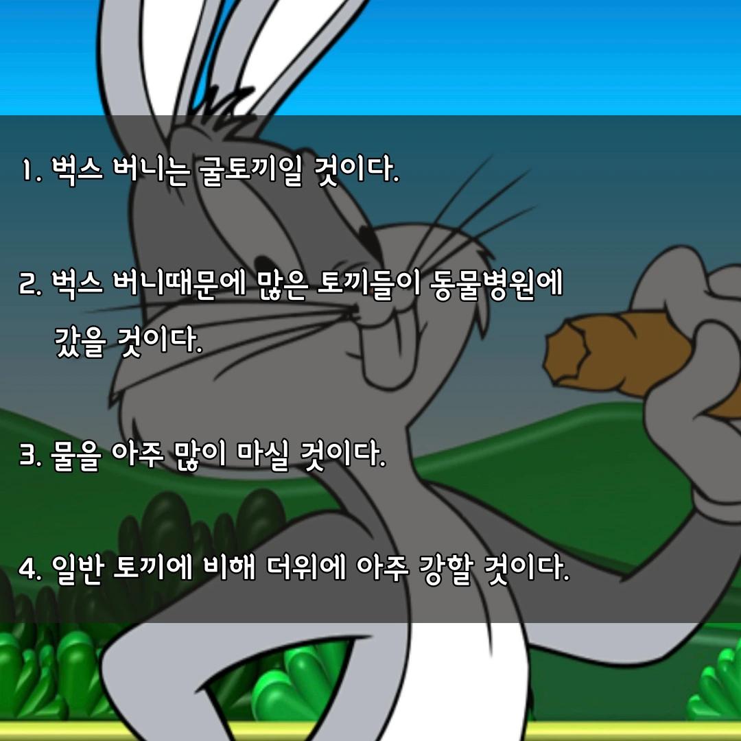 지금까지 벅스 버니에 대해서 알아보았습니다. 벅스 버니는 굴토끼로 당근을 좋아한다는 이미지를 대중에게 심어주어 수많은 애완 토끼들을 동물병원으로 보낸 원흉이며 물을 아주 많이 마시고 일반 토끼에 비해 더위에 아주 강할 것이라는 것이 제 결론이었습니다. 제리가 치즈를 먹으면서 많은 쥐들을 아프게 했던 것처럼 벅스 버니도 많은 토끼들을 아프게 했을 것 같은데요. 부디 토끼에게 과도하게 당근을 급여하지 말고 건초와 풀 위주로 급여했으면 좋겠습니다.