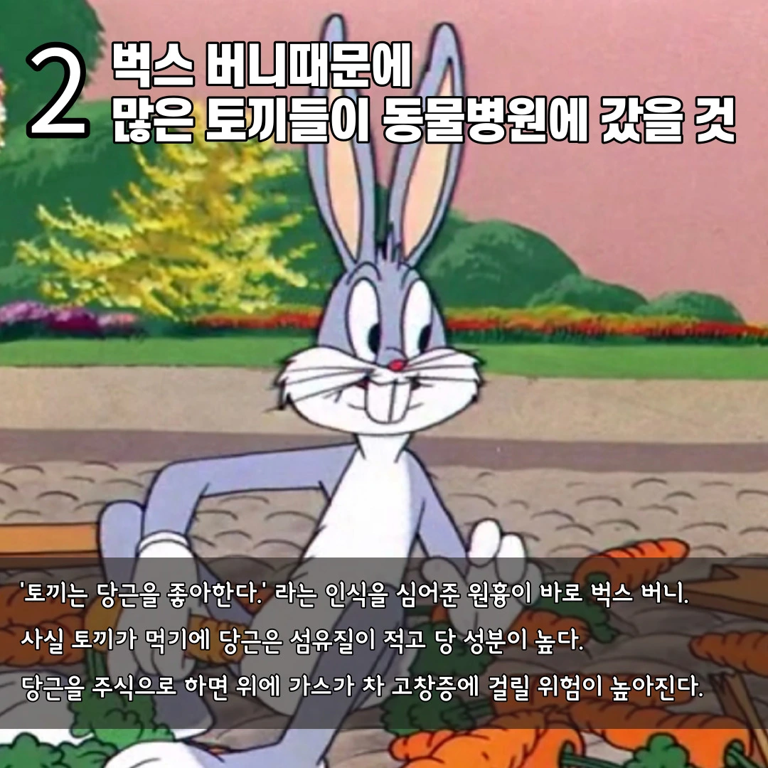 다만, 벅스 버니는 주식으로 당근을 먹습니다. 당근의 경우 건초나 풀에 비해 섬유질의 양은 적은데 당 성분은 많아 토끼들이 주식으로 먹기에는 절대 적합하지 않은 채소입니다. 만약 토끼들이 당근을 주식으로 먹을 경우 과도한 탄수화물(당)로 인해 비만도 올 수 있지만 위에 가스가 차서 고창증이 발생할 수 있습니다. 고창증이란 어떠한 이유로 위에 가스가 차서 주변 장기 조직을 압박하여 괴사시키고 호흡을 곤란하게 하는 질병으로 생명에 굉장히 위협을 줄 수 있는 질병입니다. 벅스 버니는 운 좋게 고창증에 걸리지 않은 것으로 보이지만 ‘토끼는 당근을 좋아한다.’라는 이미지를 심어준 것 때문에 다른 토끼들이 비만과 고창증으로 동물병원에 갔을 수도 있습니다. 토끼는 토끼에게 맞는 건초와 풀을 급여하시는 것이 좋습니다.