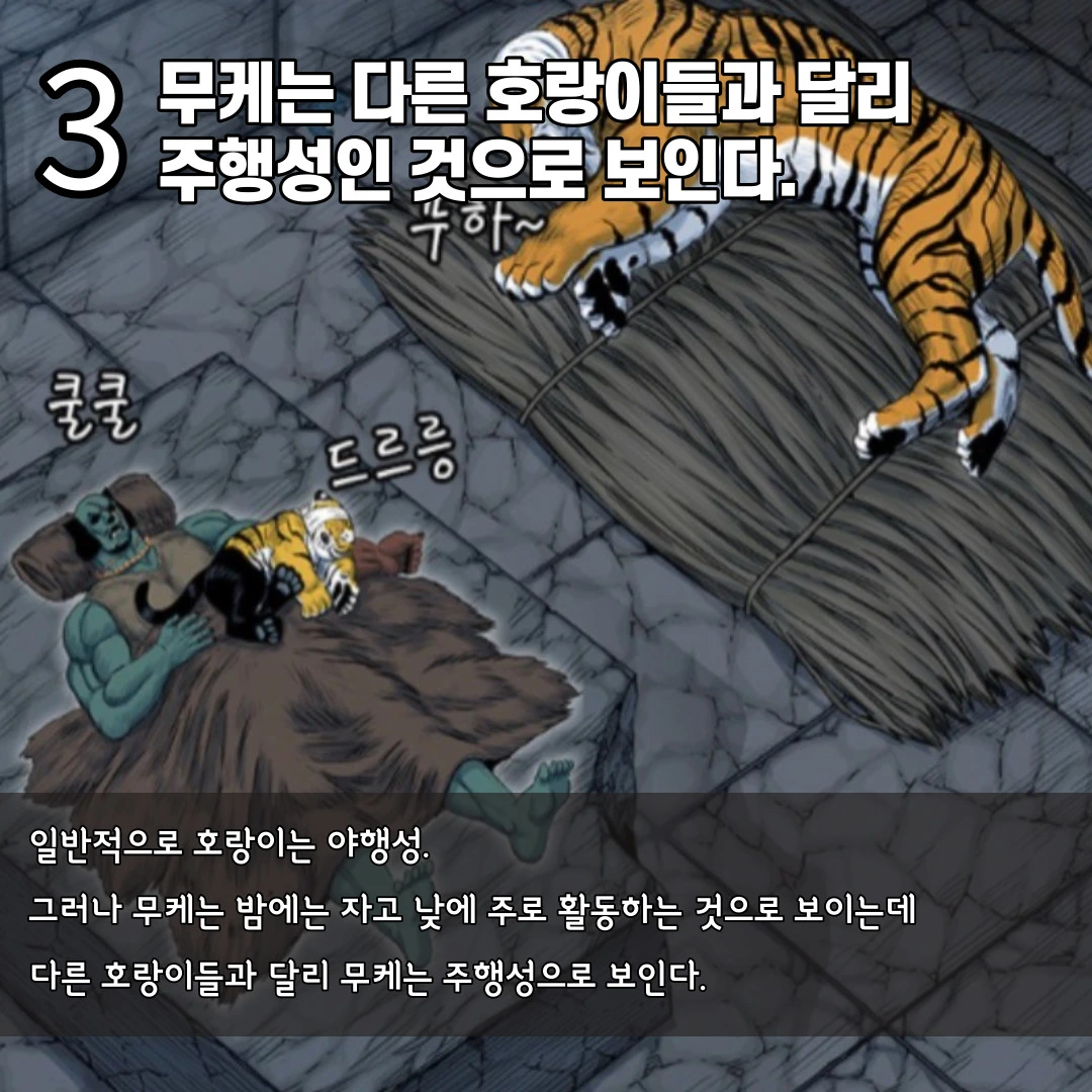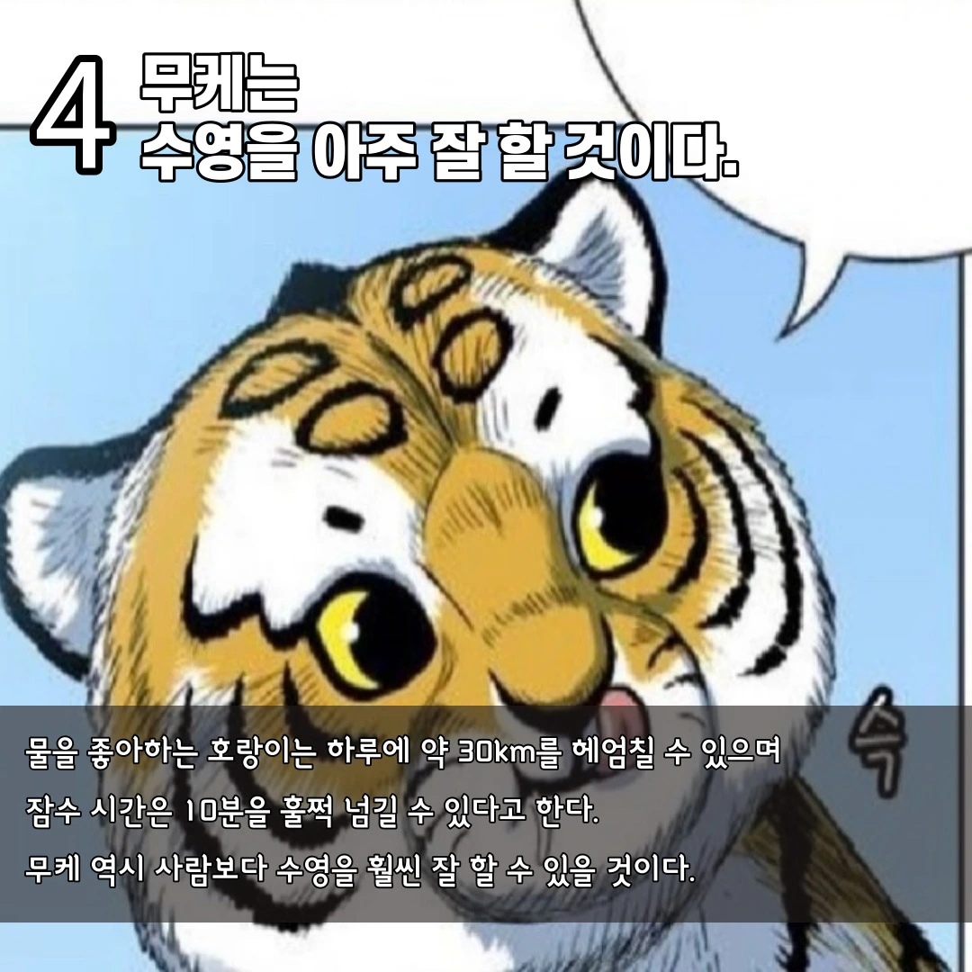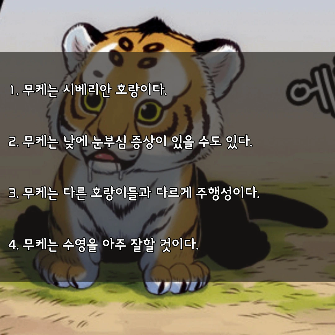 지금까지 무케에 대해서 알아보았습니다. 무케는 시베리아 호랑이로 큰 동공으로 인해 낮에 눈부심 증상이 있을 수도 있으며 주행성이고 수영을 잘할 것이라는 것이 제 결론이었습니다. 호랑이라는 동물을 가장 잘 묘사한 ‘호랑이 형님’. 앞으로도 흥미진진한 스토리로 사람들에게 더욱 재미를 선사해 주었으면 좋겠습니다. 또한 무케도 잘 성장해서 아주 강력한 캐릭터로 거듭났으면 좋겠습니다.